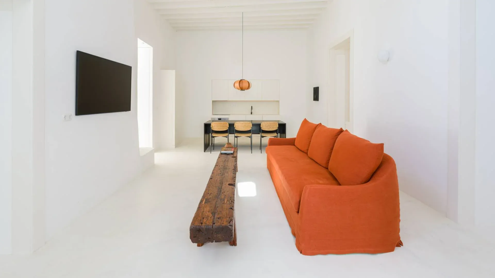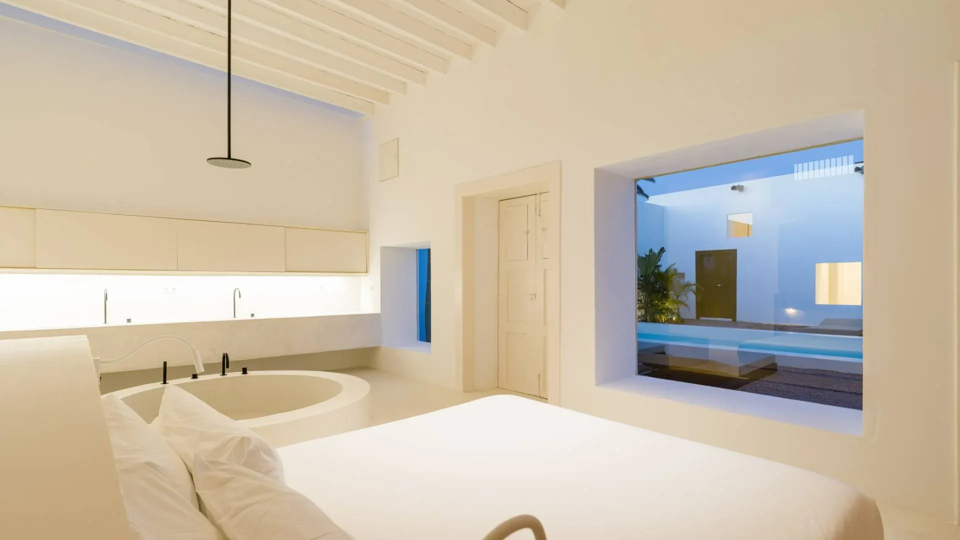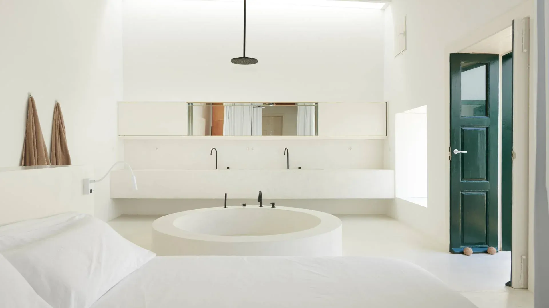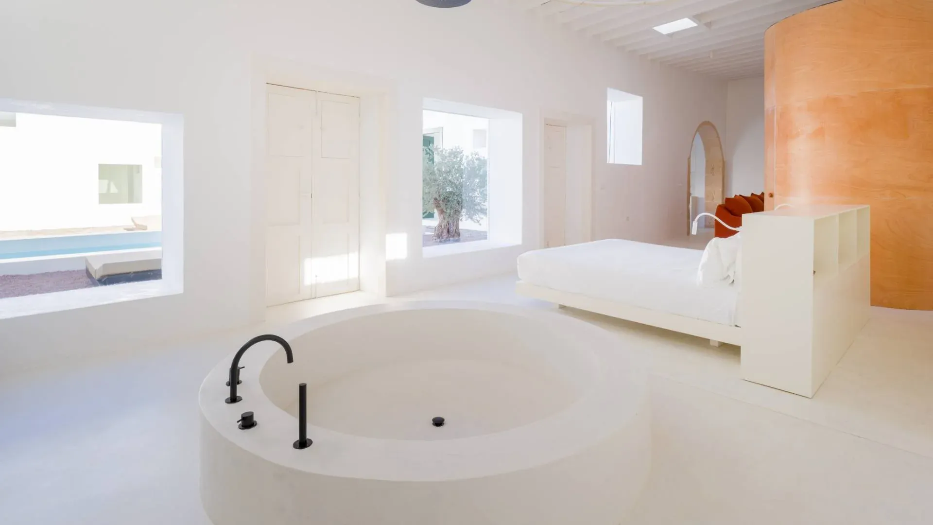 This unit can accommodate 2 people. It features a kitchen-dining area, a spacious living room, a bedroom with a walk-in closet, and a bathroom with a rain shower in an open-plan space.