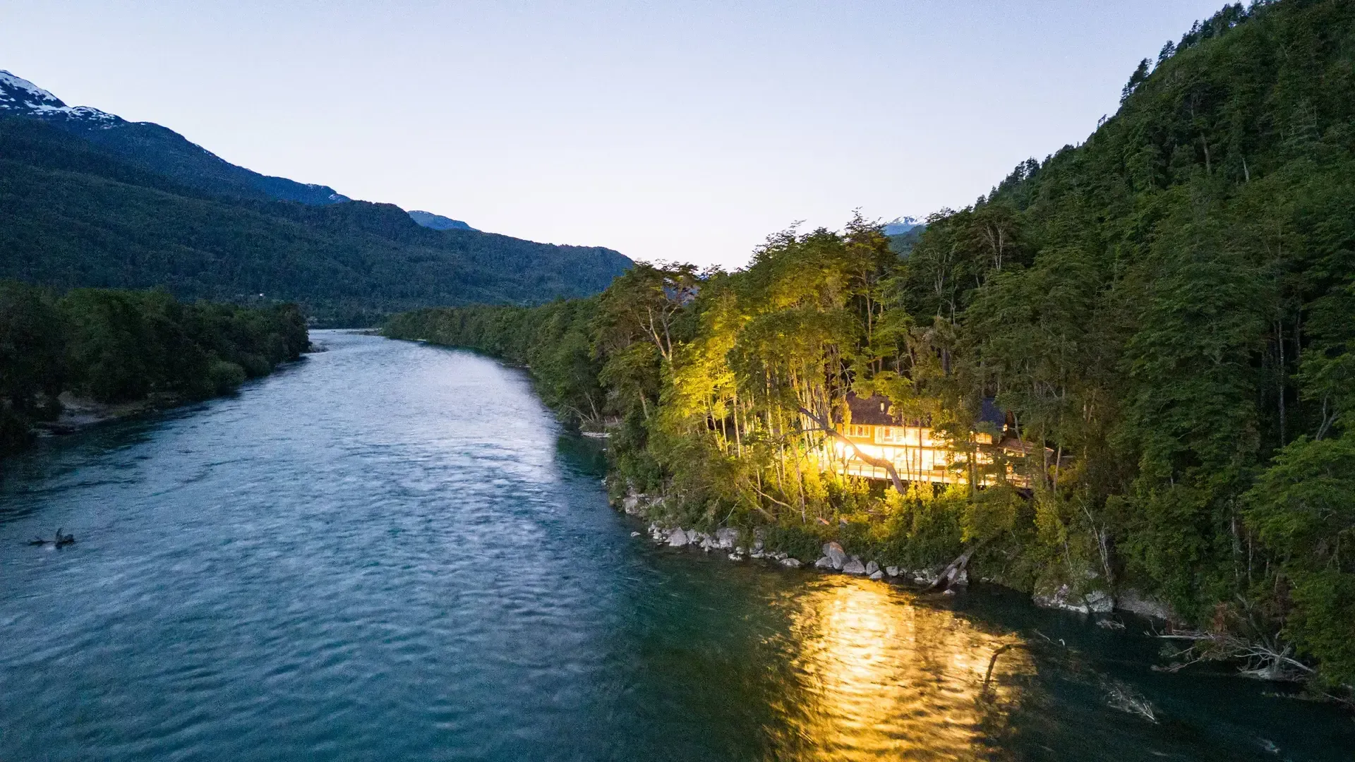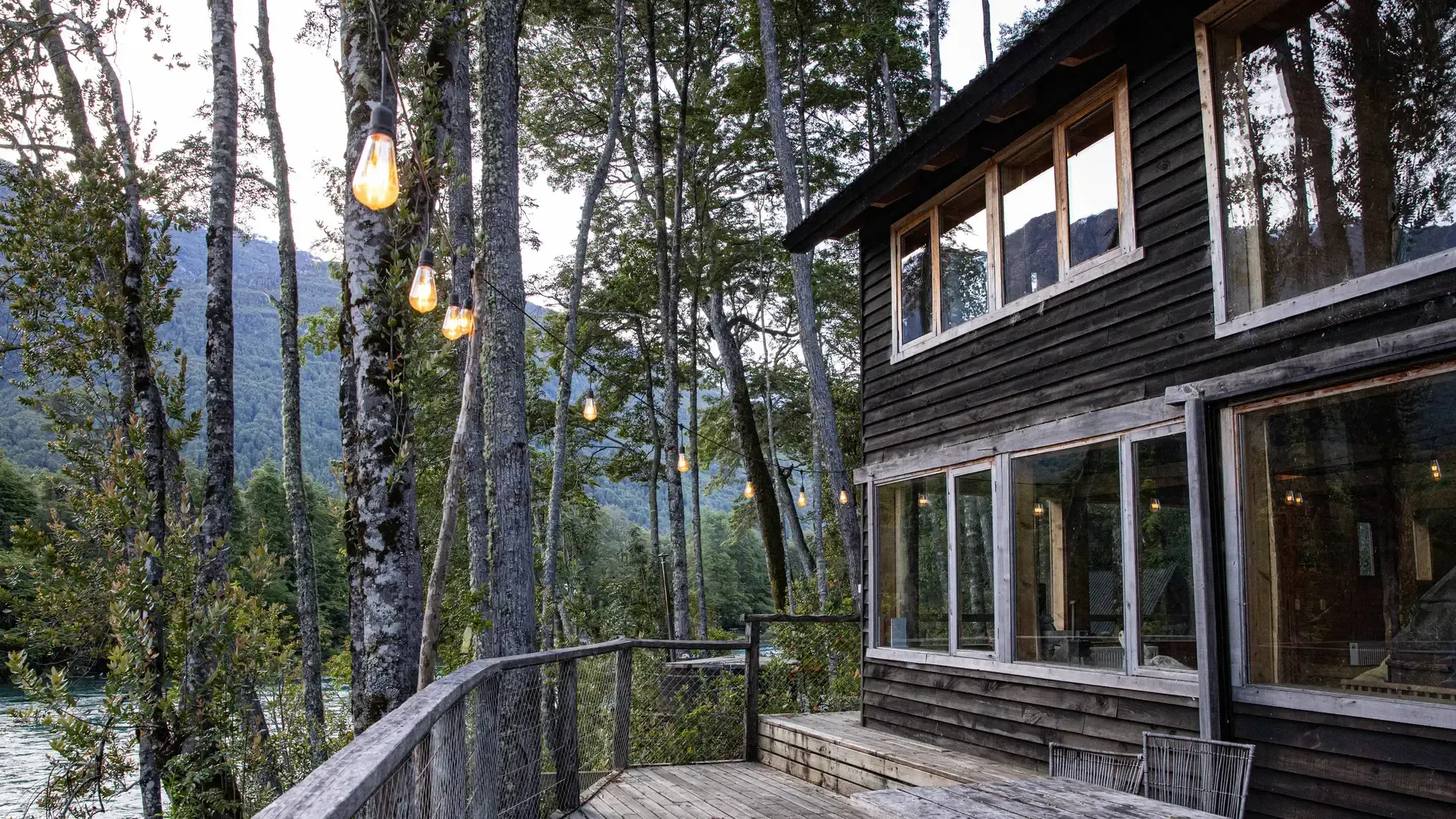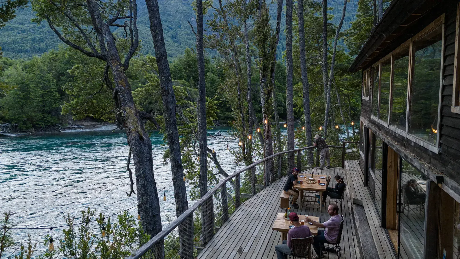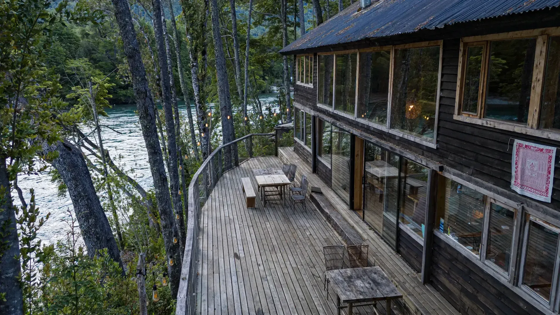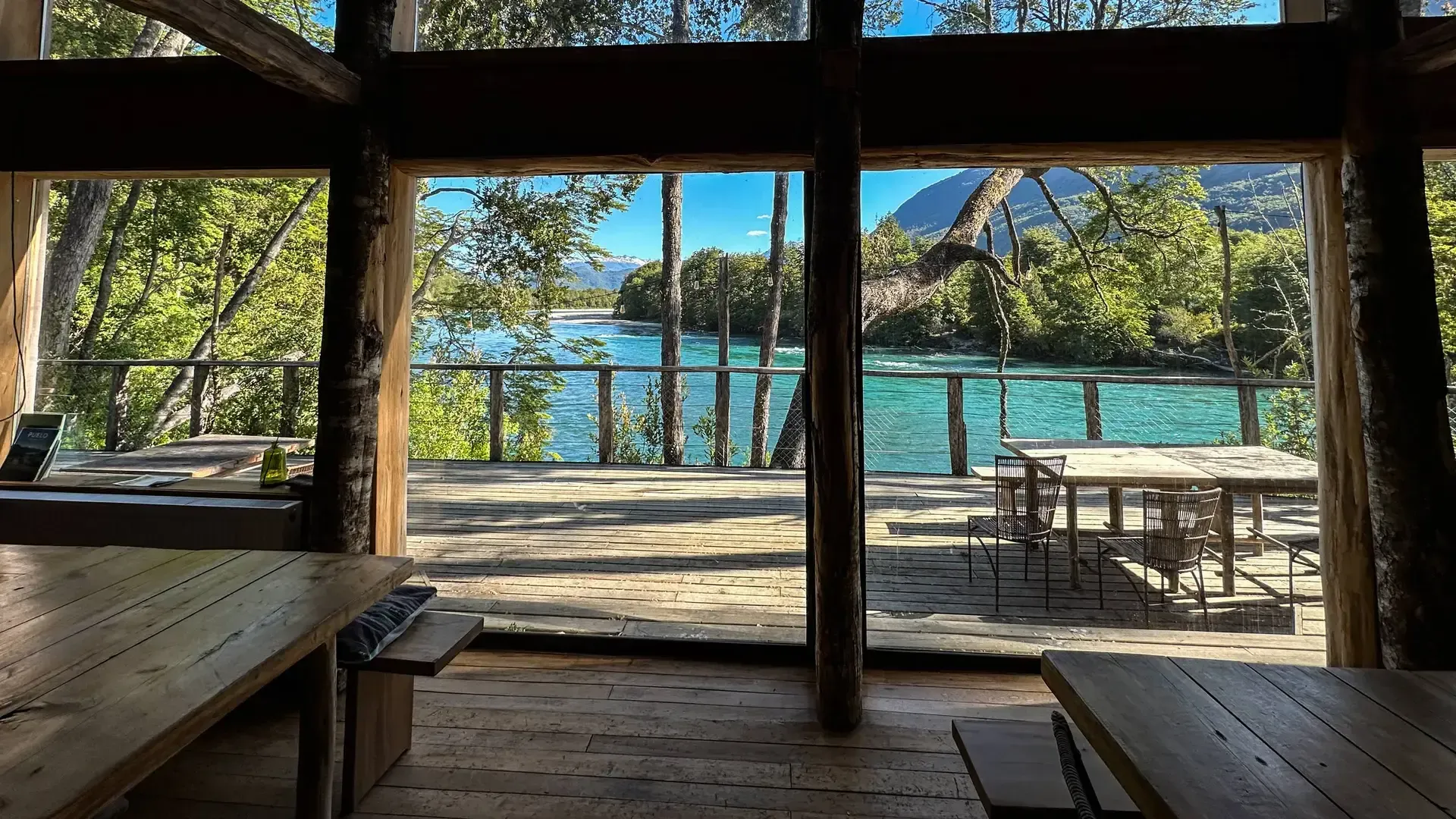 Constructed with warm timber and expansive windows that draw in the patagonian air, the building seems to echo the rhythm of the river below. Inside, common spaces beckon with soft lighting and comfortable furnishings, while the upstairs rooms open onto vistas of flowing water and mountain ridges.
