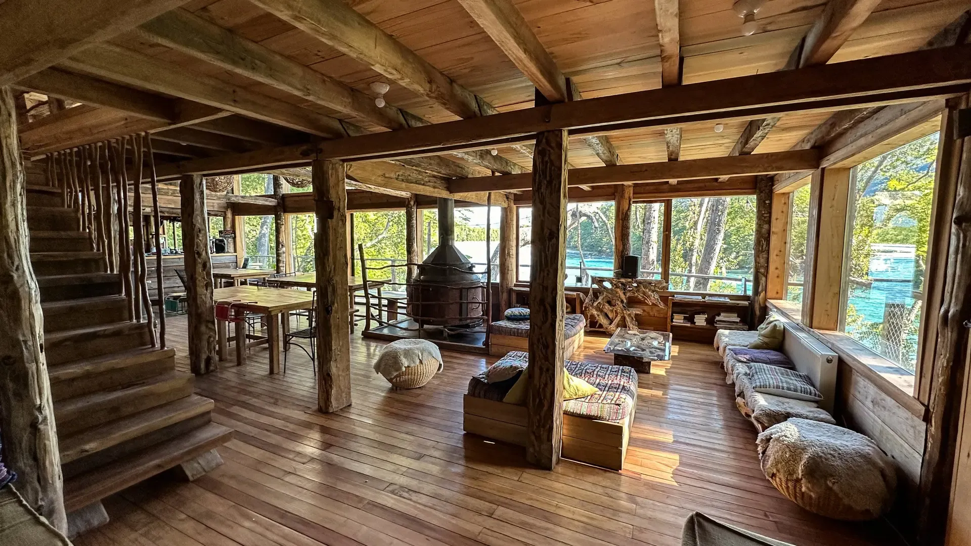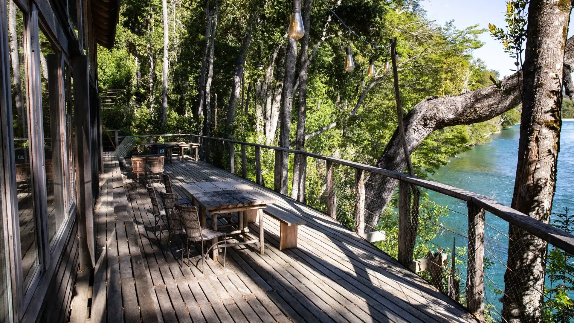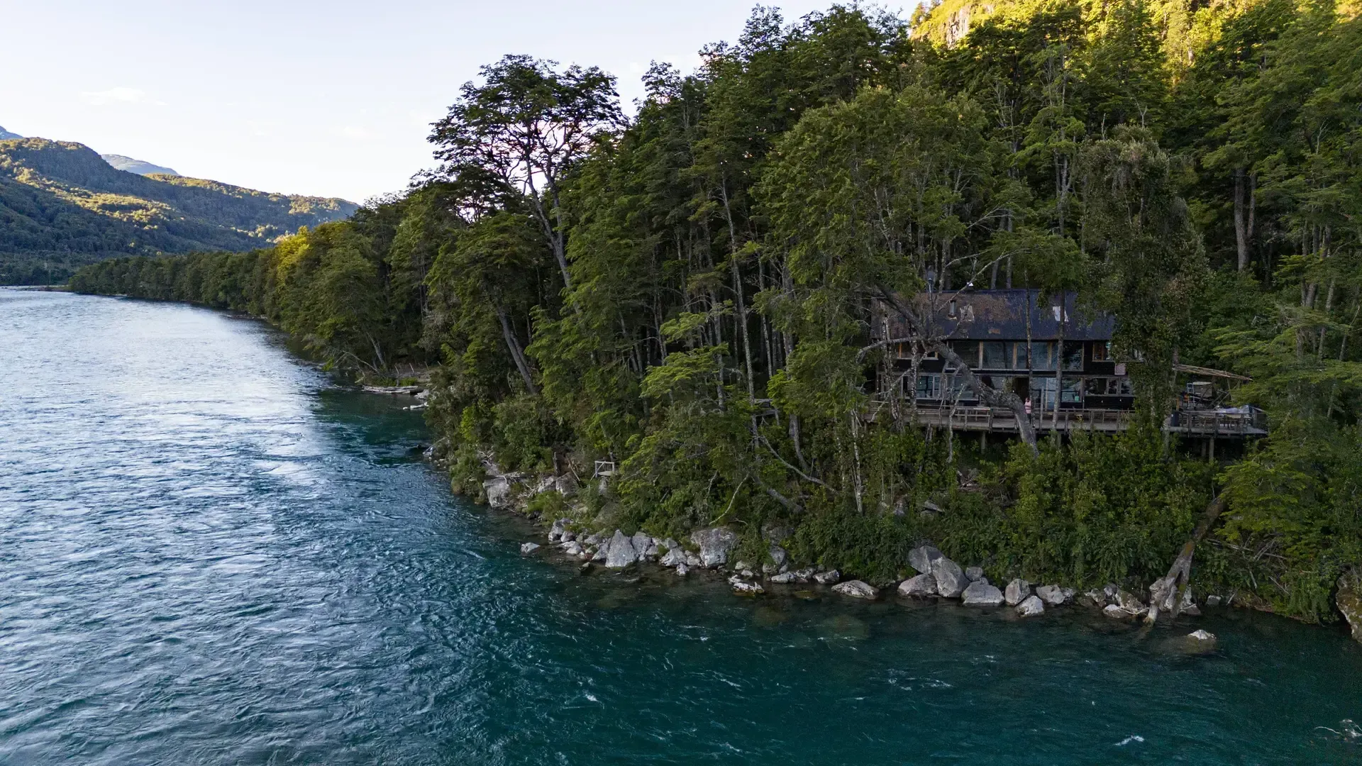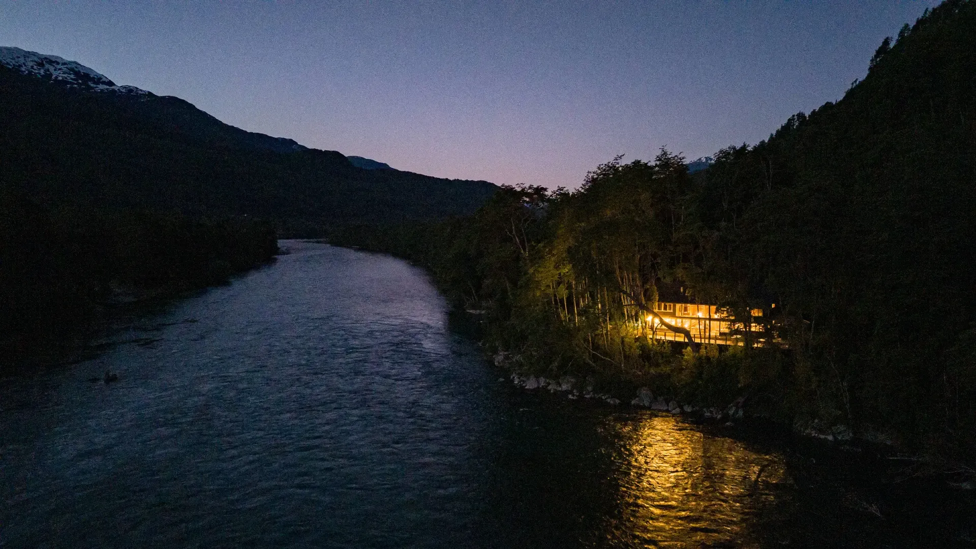 Constructed with warm timber and expansive windows that draw in the patagonian air, the building seems to echo the rhythm of the river below. Inside, common spaces beckon with soft lighting and comfortable furnishings, while the upstairs rooms open onto vistas of flowing water and mountain ridges.