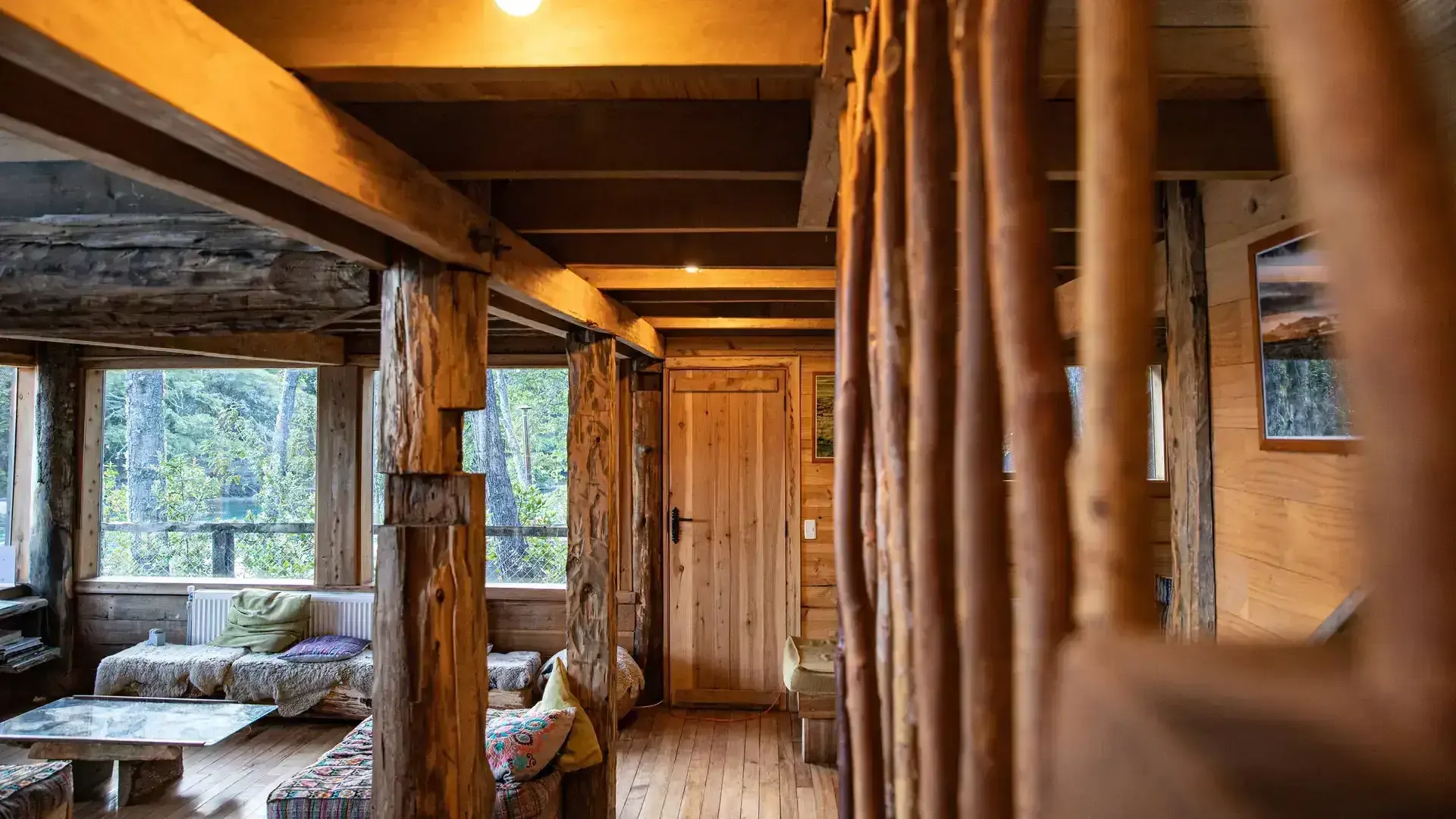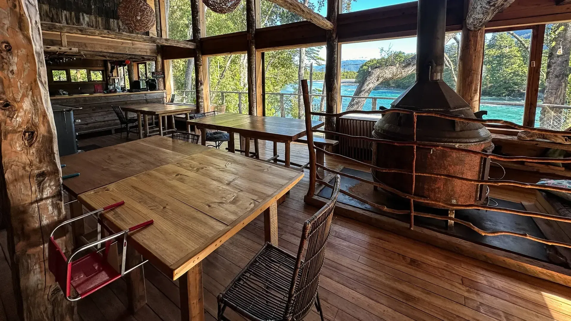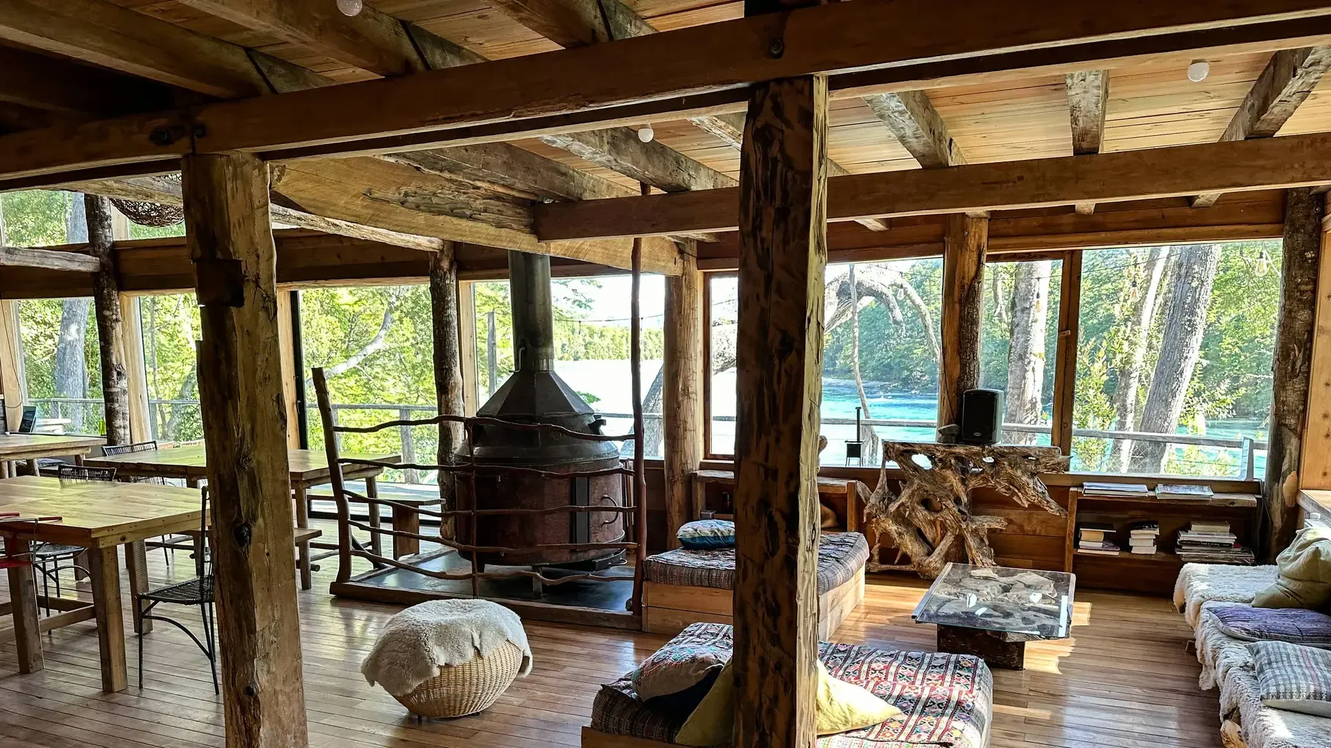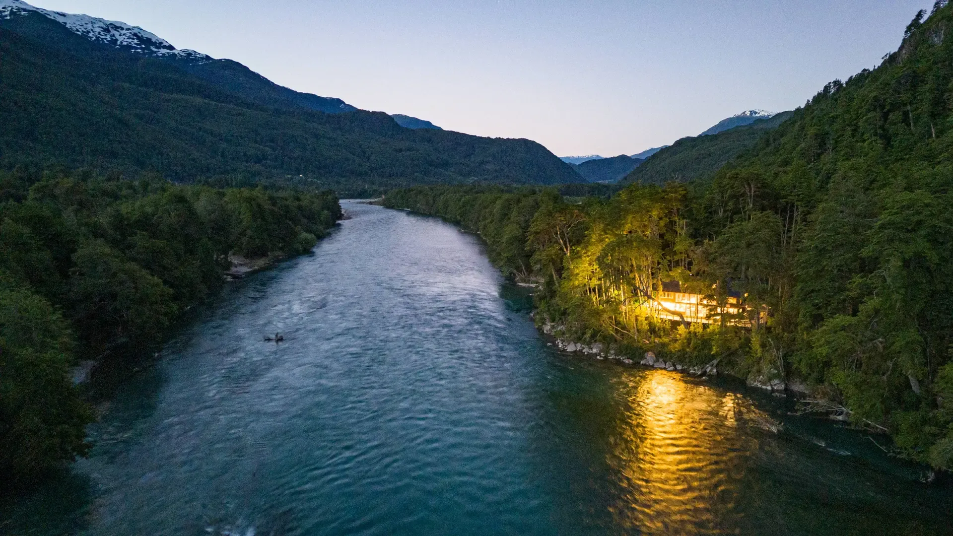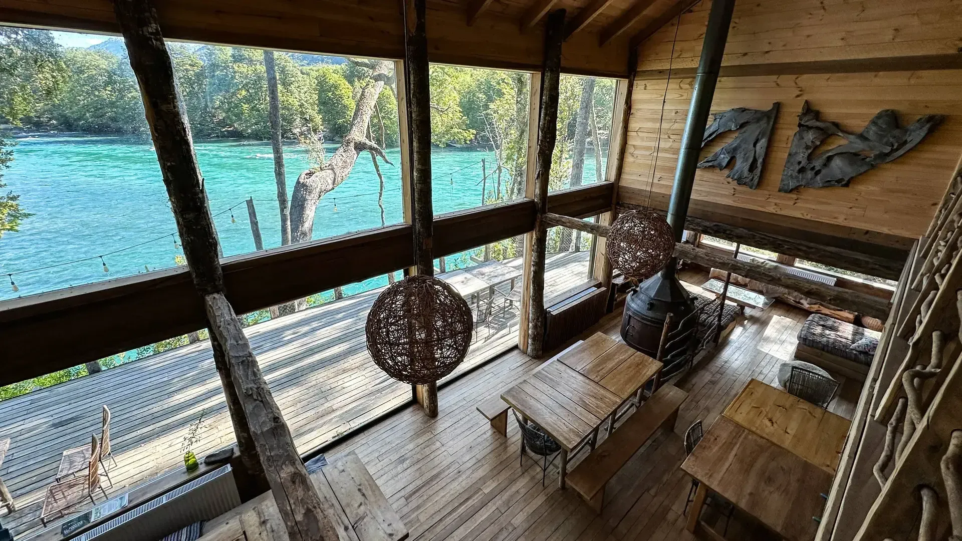 Constructed with warm timber and expansive windows that draw in the patagonian air, the building seems to echo the rhythm of the river below. Inside, common spaces beckon with soft lighting and comfortable furnishings, while the upstairs rooms open onto vistas of flowing water and mountain ridges.