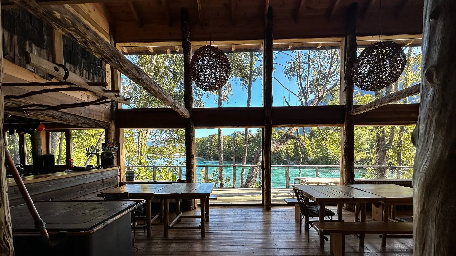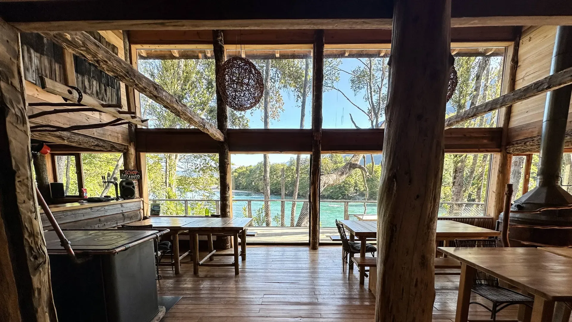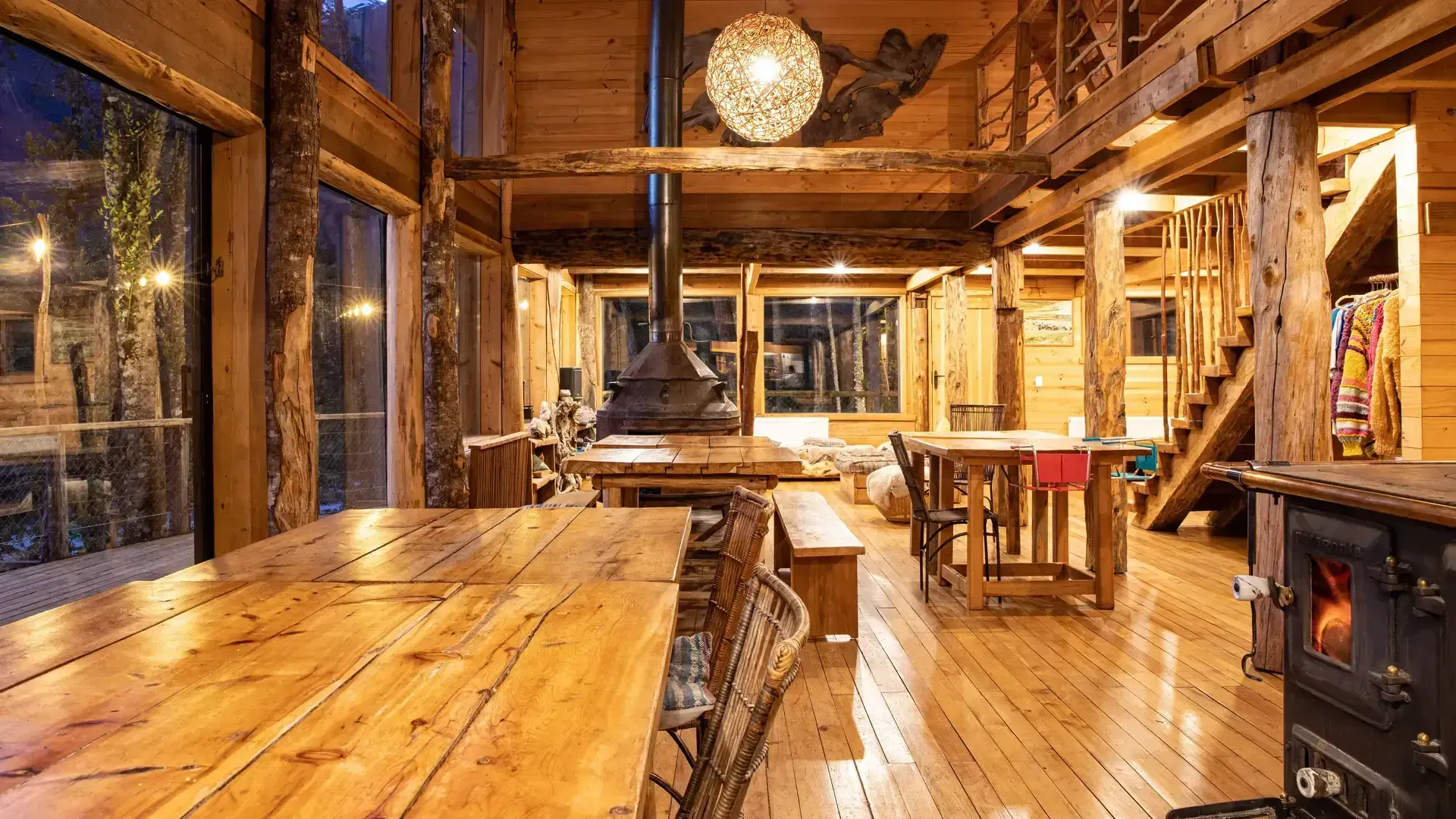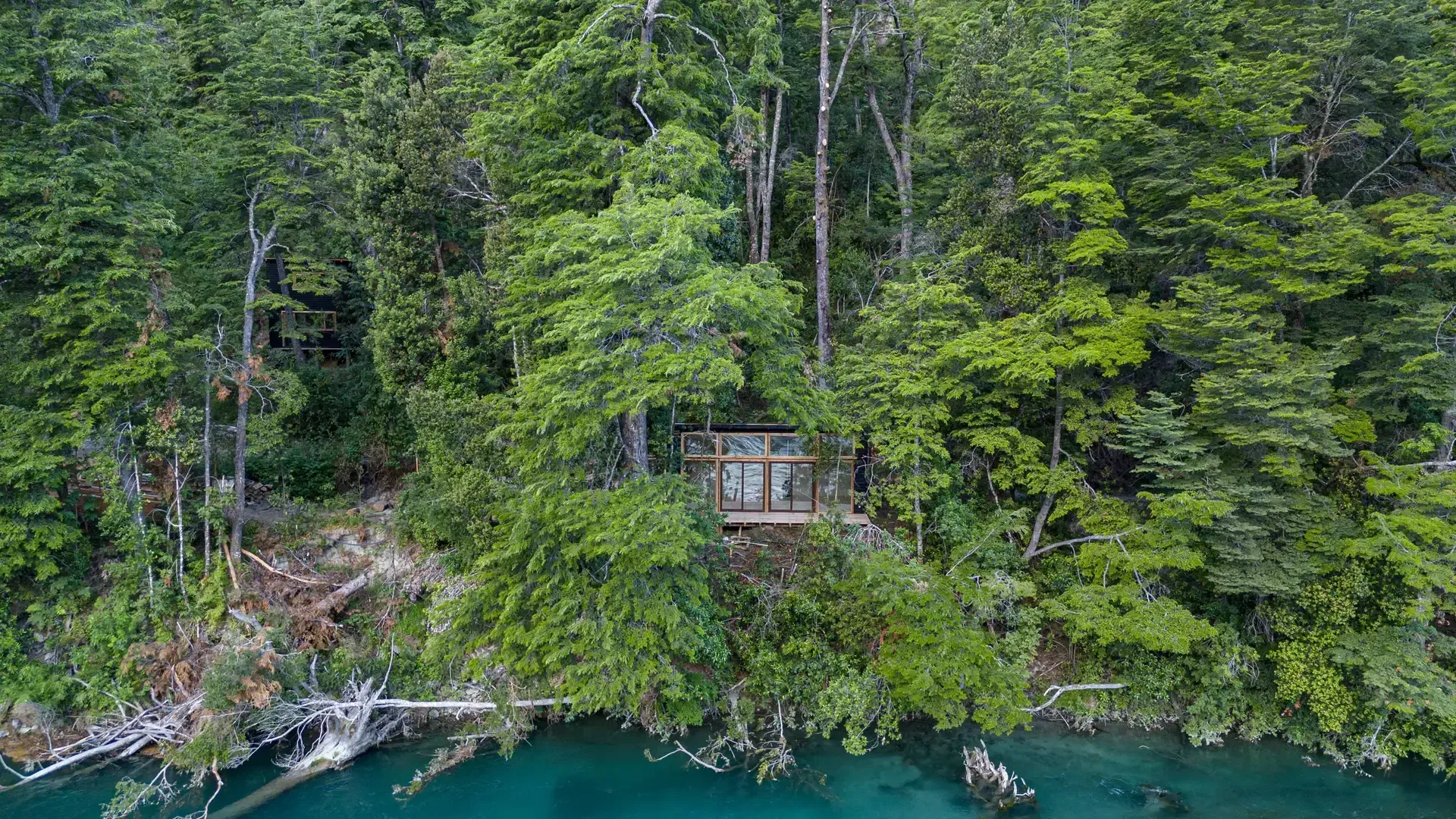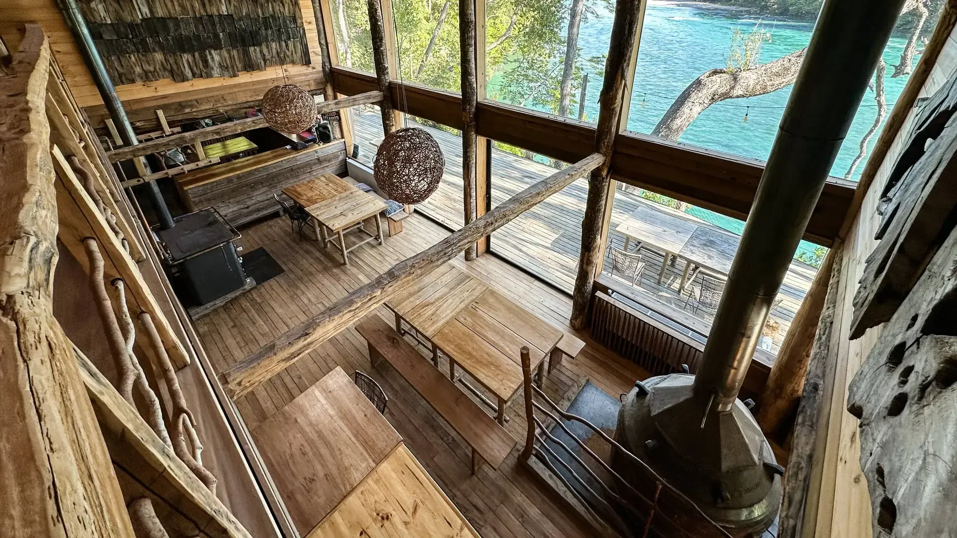 Constructed with warm timber and expansive windows that draw in the patagonian air, the building seems to echo the rhythm of the river below. Inside, common spaces beckon with soft lighting and comfortable furnishings, while the upstairs rooms open onto vistas of flowing water and mountain ridges.