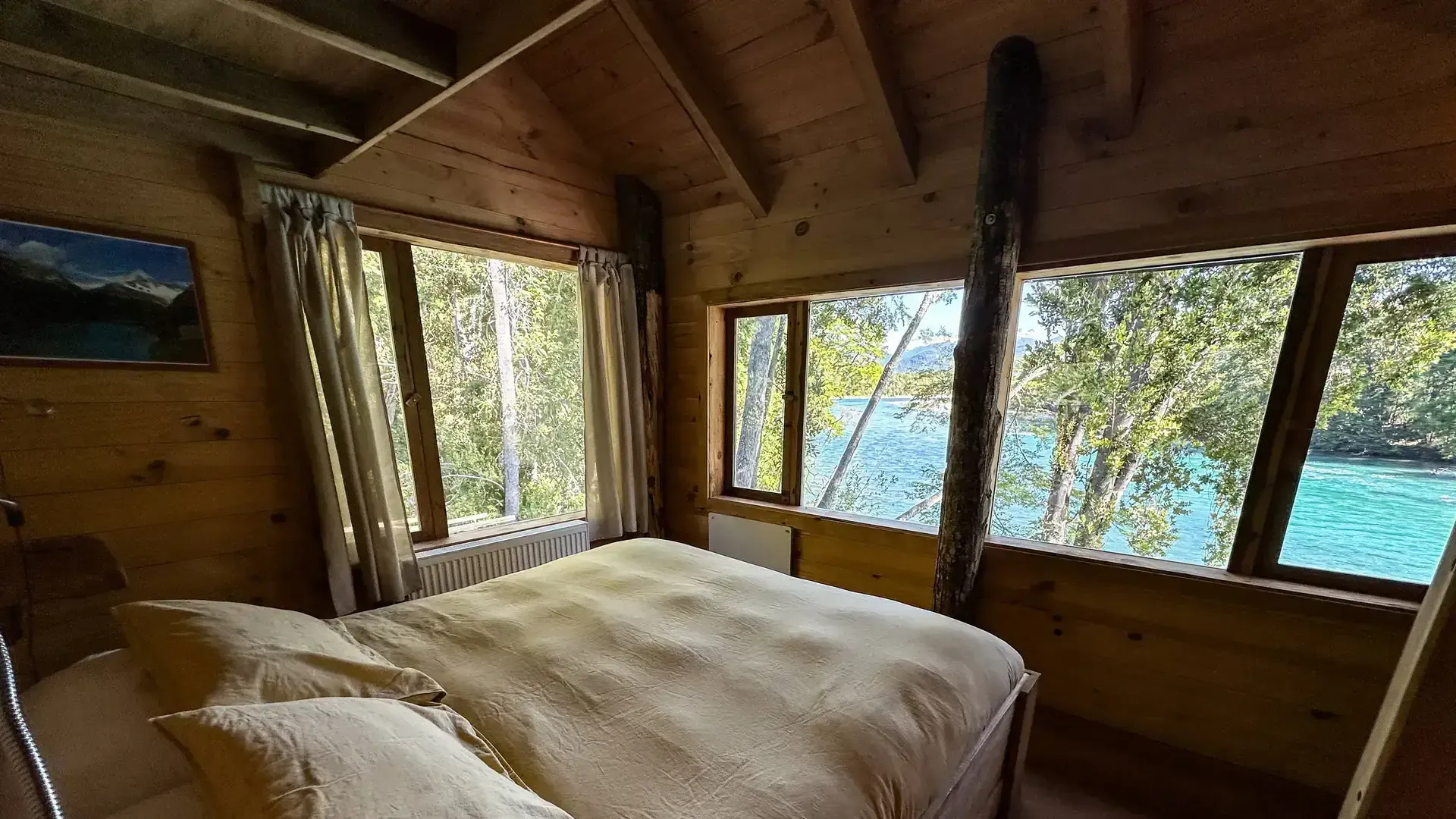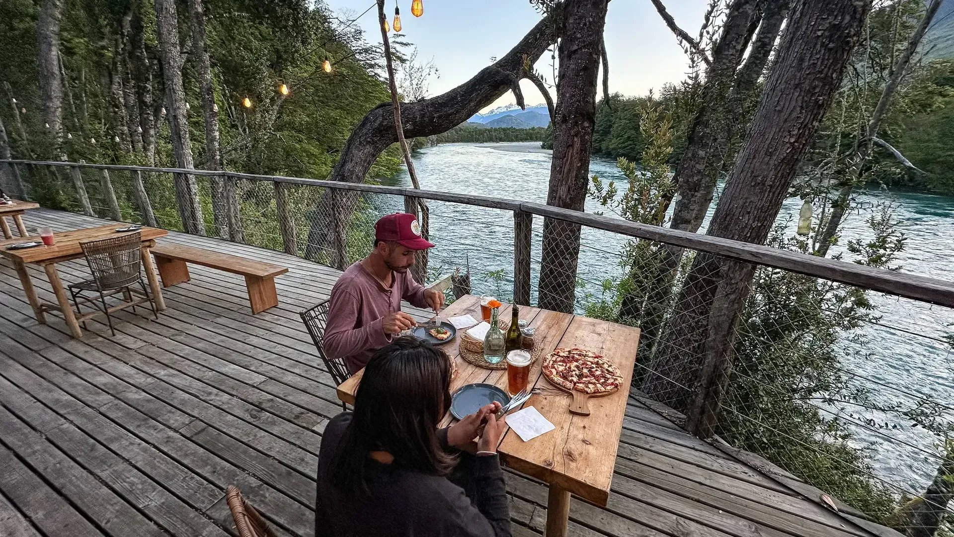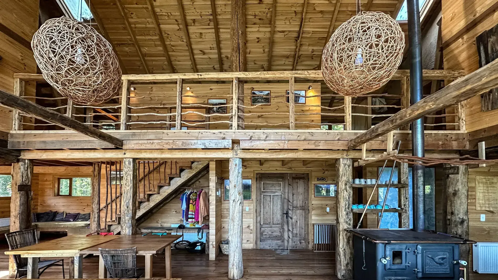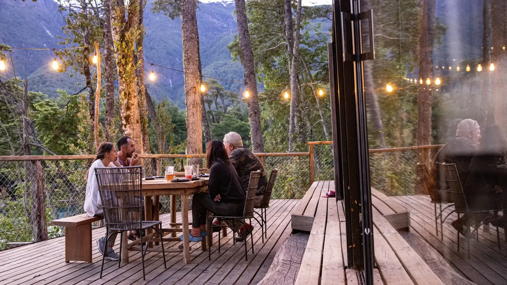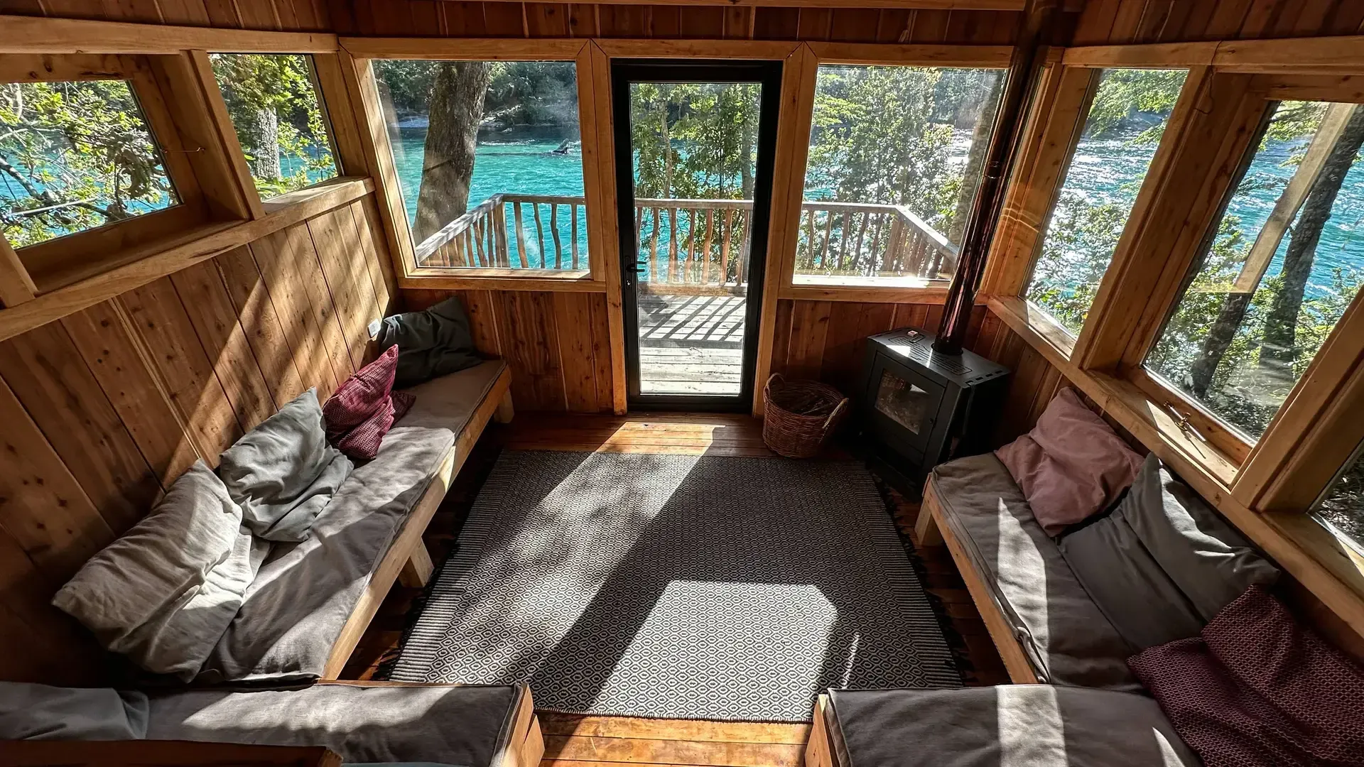 Constructed with warm timber and expansive windows that draw in the patagonian air, the building seems to echo the rhythm of the river below. Inside, common spaces beckon with soft lighting and comfortable furnishings, while the upstairs rooms open onto vistas of flowing water and mountain ridges.