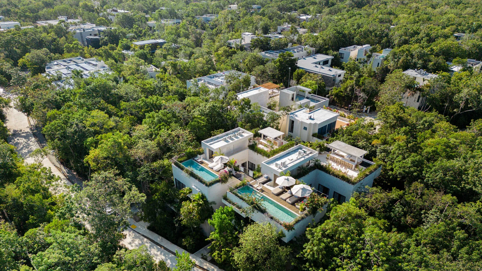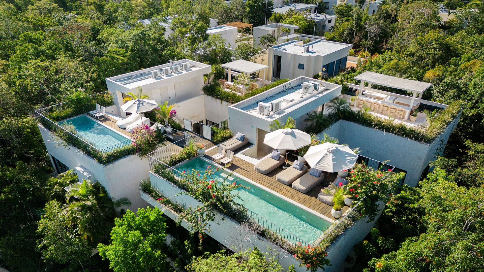 Each villa is a testament to intentional simplicity, featuring spacious bedrooms adorned with king-size beds and ensuite bathrooms, some boasting outdoor glass-enclosed showers that offer an immersive experience with the elements. Fully equipped chef-style kitchens and multiple dining areas provide the perfect setting for intimate gatherings, while stunning rooftop terraces, complete with expansive swimming pools and grill bars, present panoramic vistas of the surrounding jungle—a sublime backdrop for relaxation and socializing.