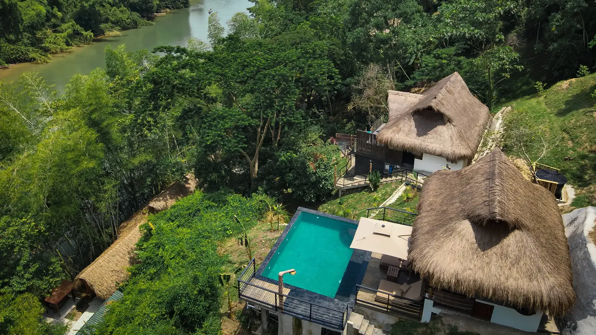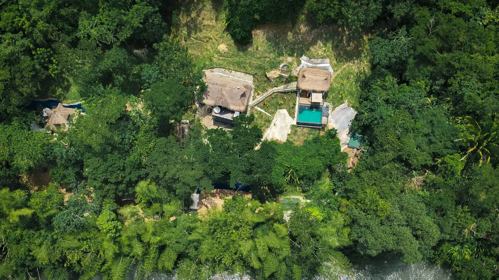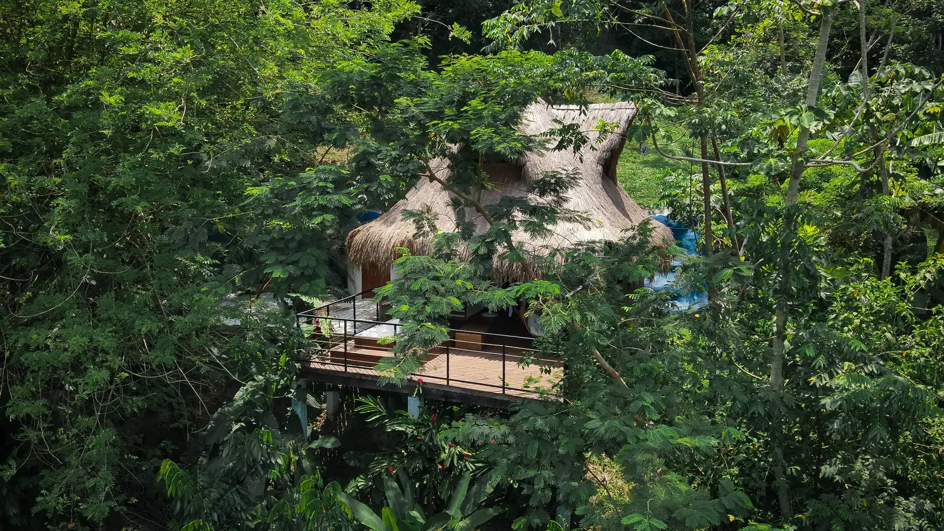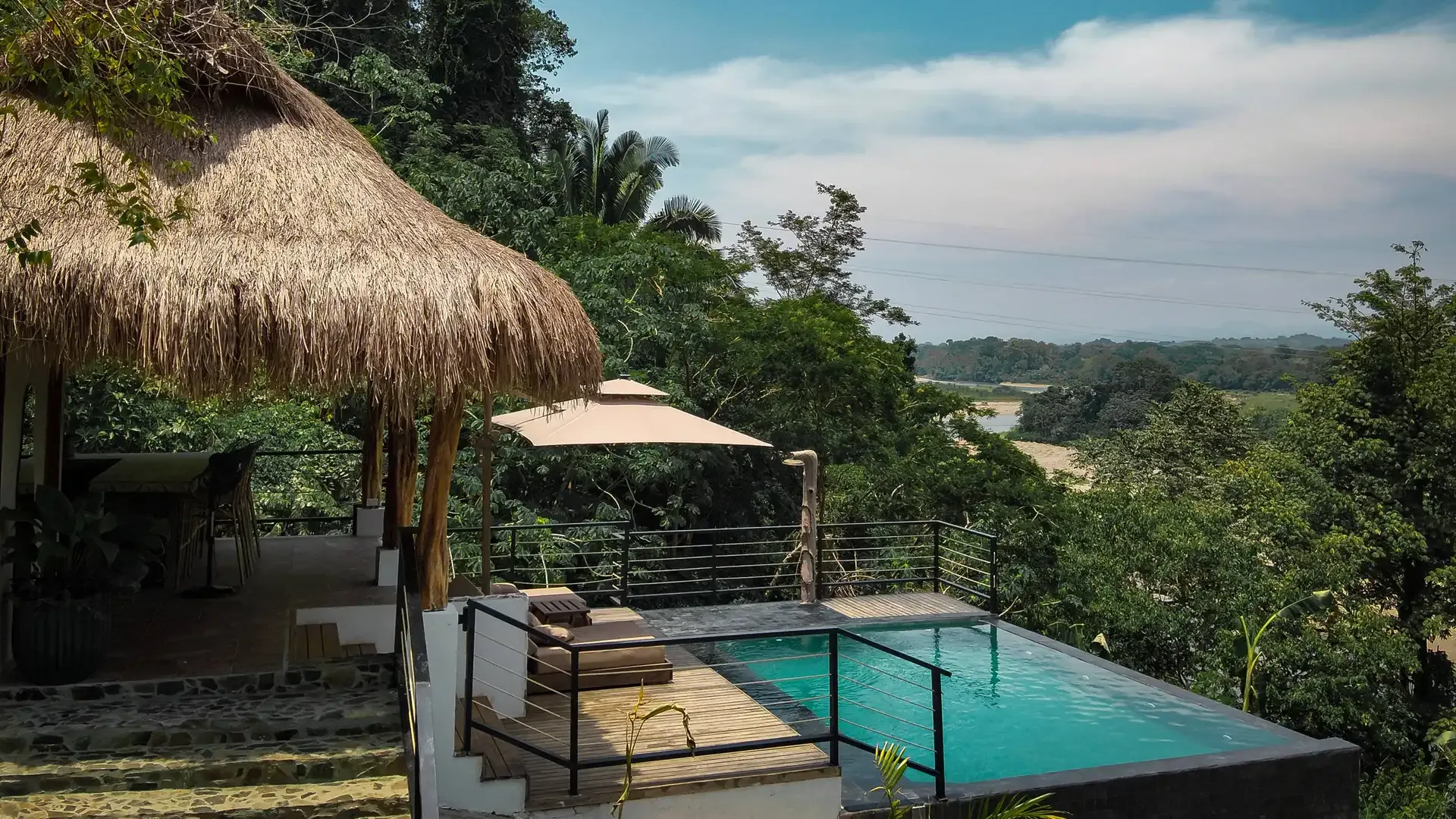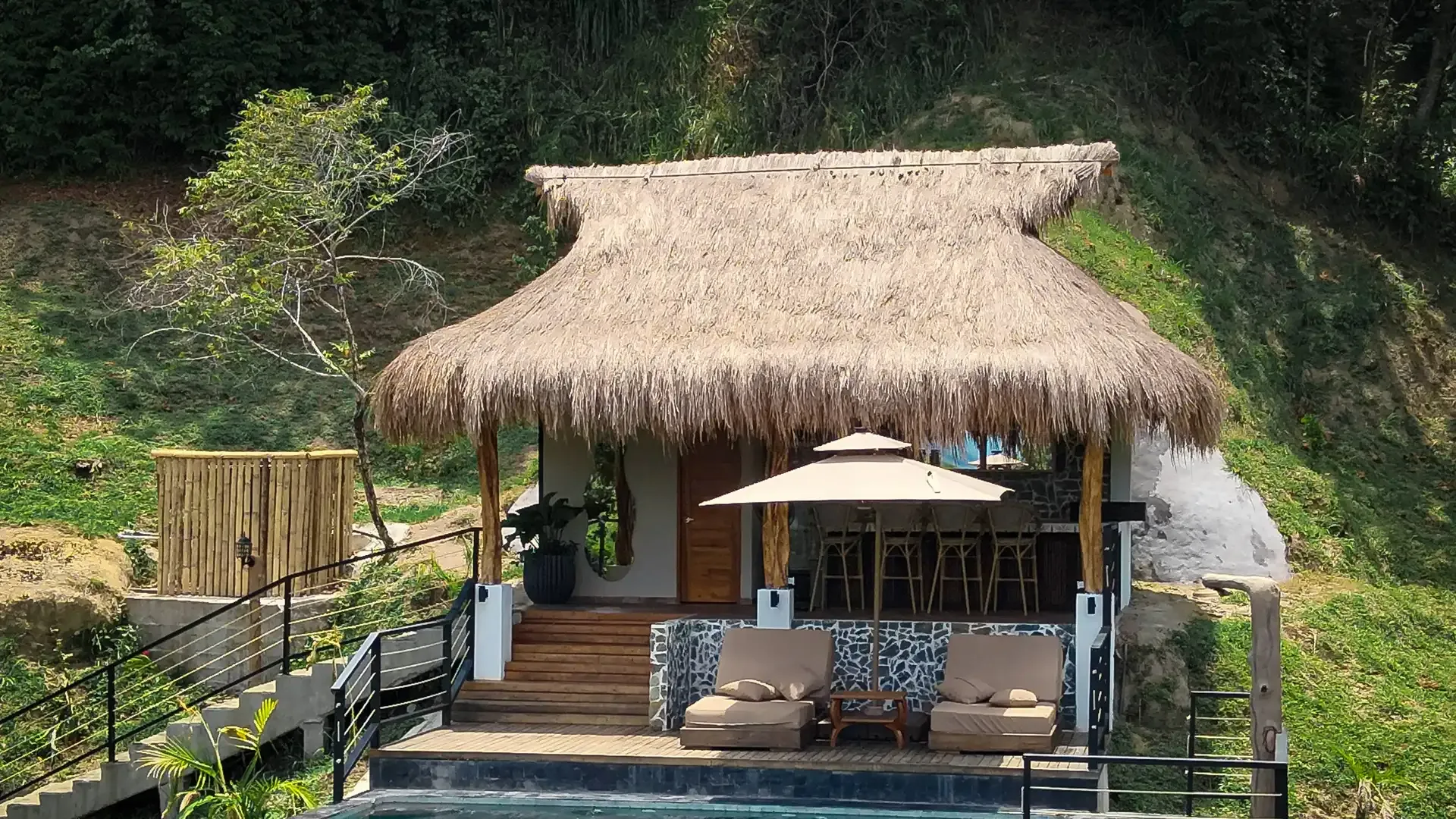 The retreat features six private cabins, a spa, a Balinese-style infinity pool, a restaurant, a bar, and communal spaces that balance group connection with personal retreat. Perched along the mountainside, the pool merges seamlessly with the landscape, offering serene views of the jungle and sky.