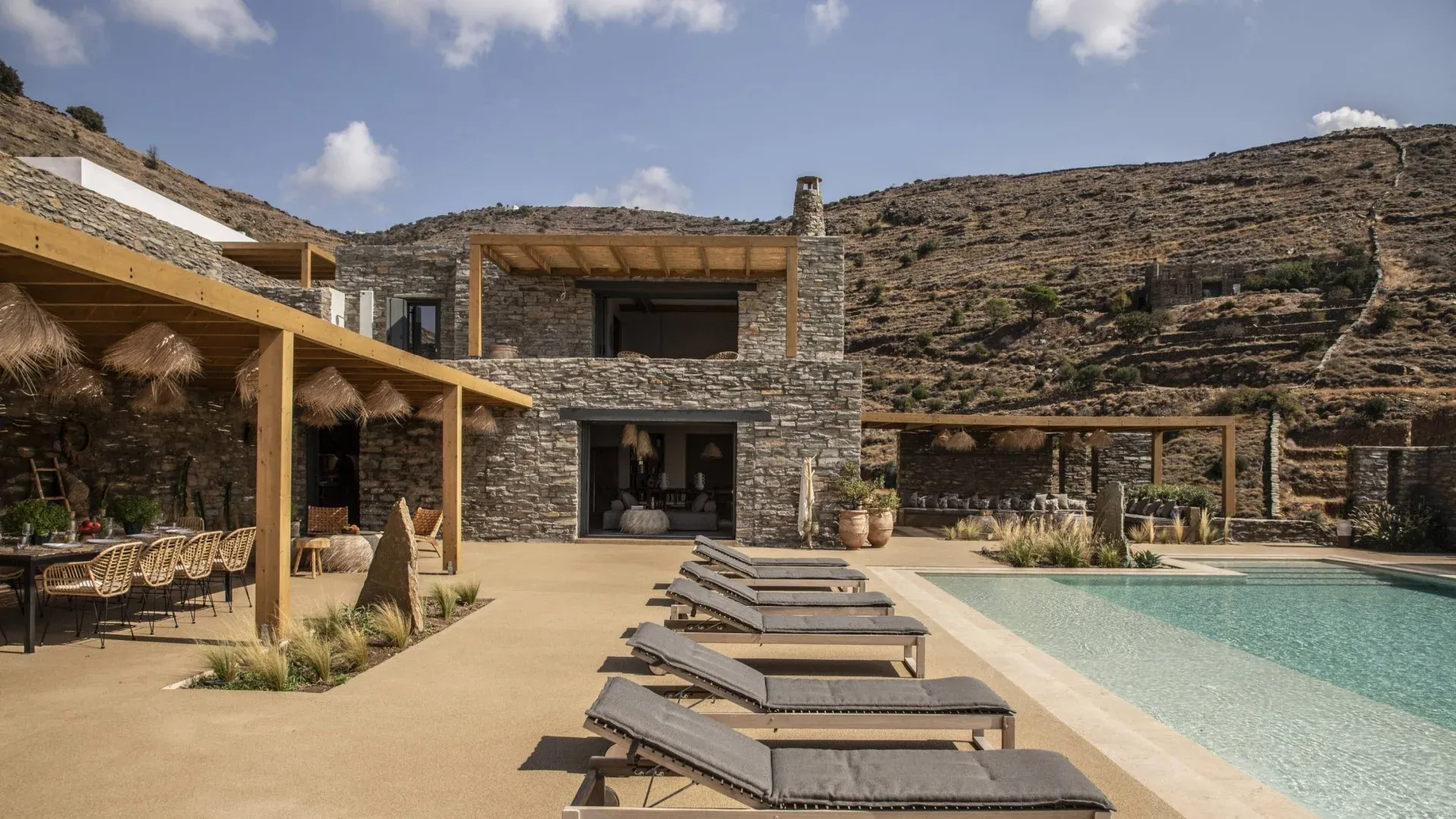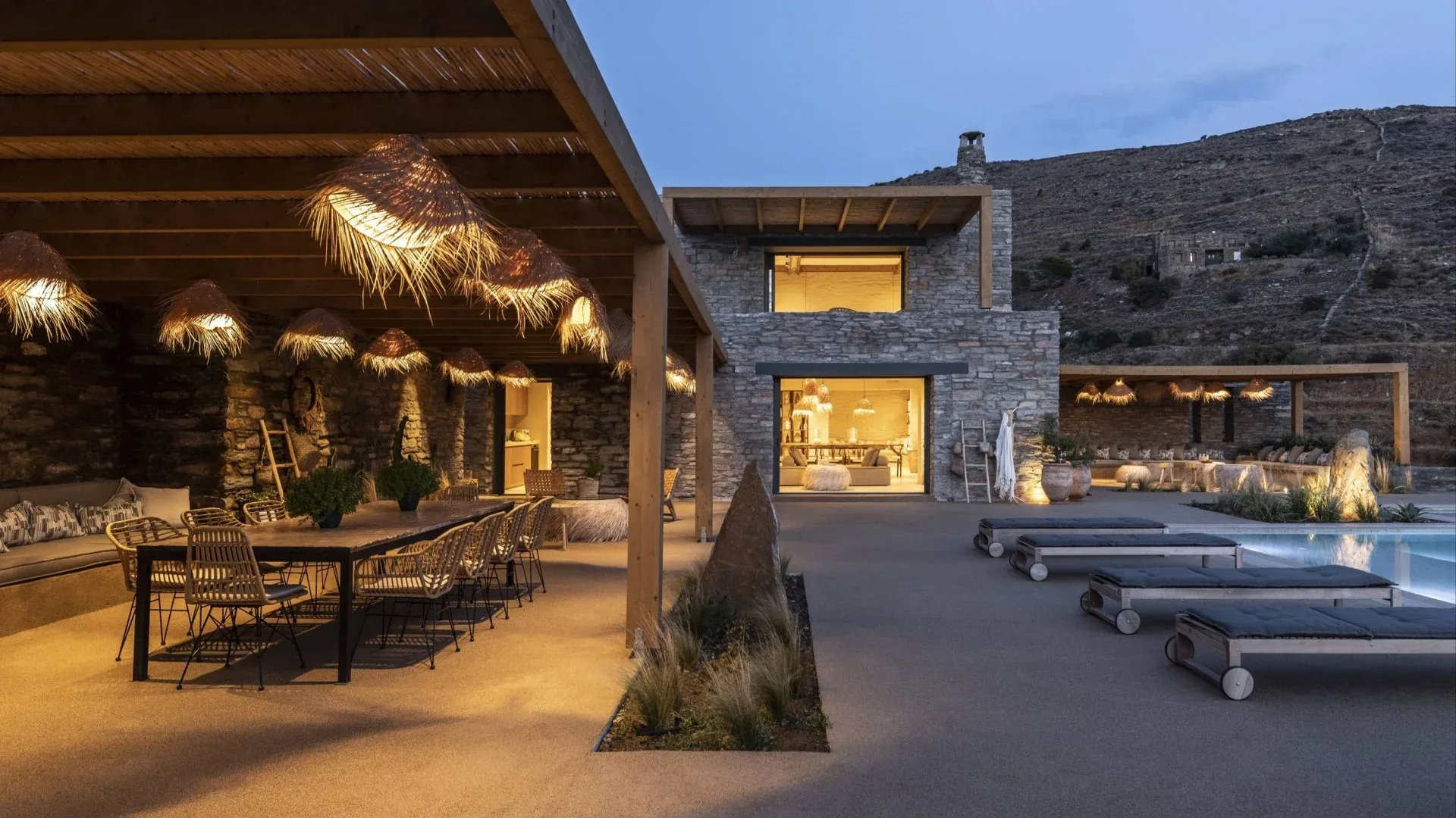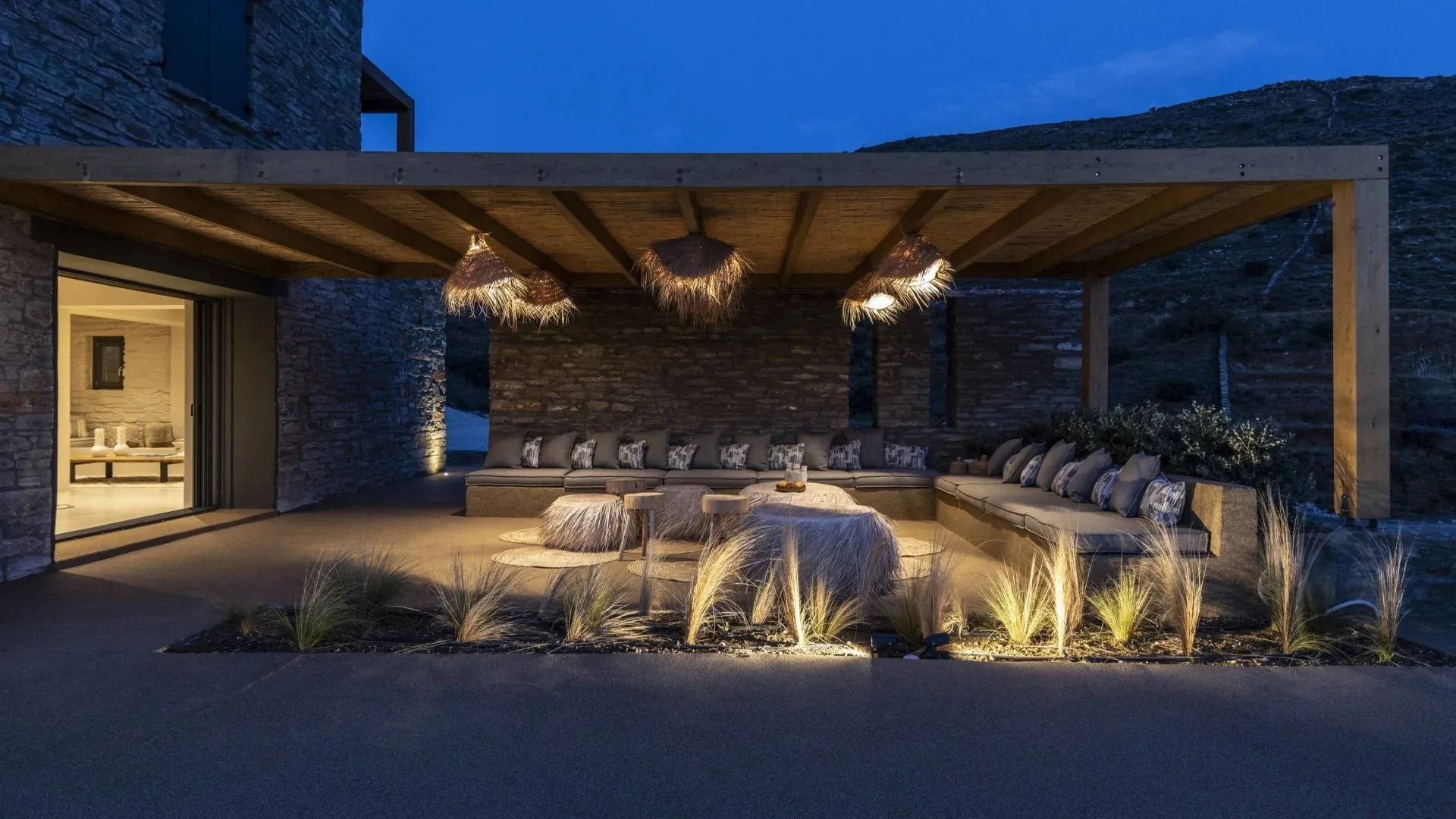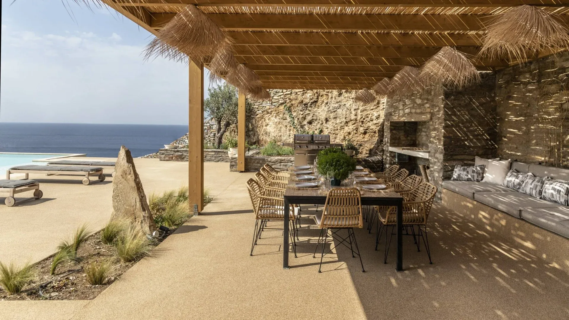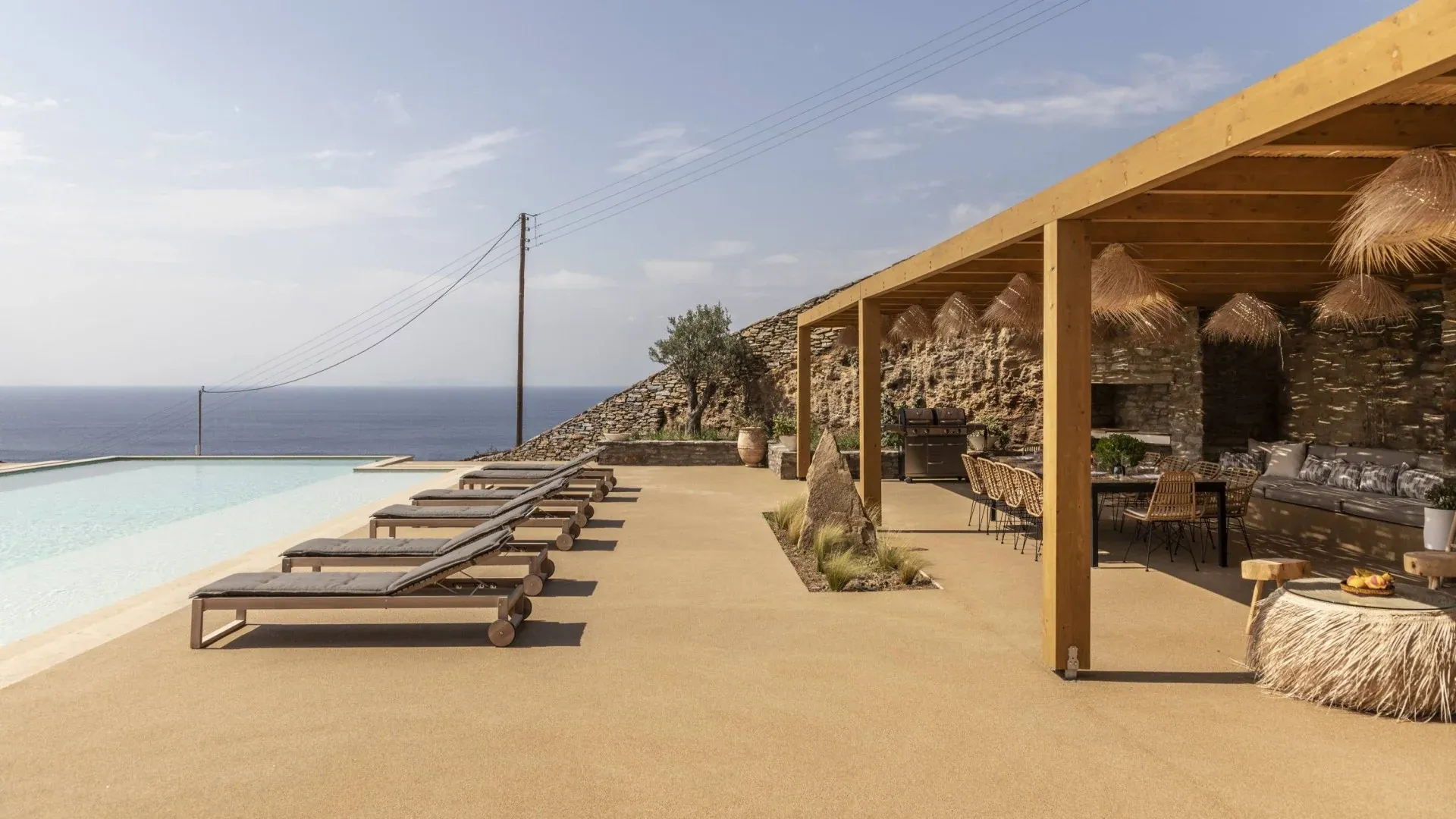 The outdoor spaces at Villa Nāos are a sanctuary of serenity. The private pool beckons guests to cool off while soaking in the panoramic views. Lush gardens surround the property, providing a verdant backdrop for moments of peaceful contemplation.