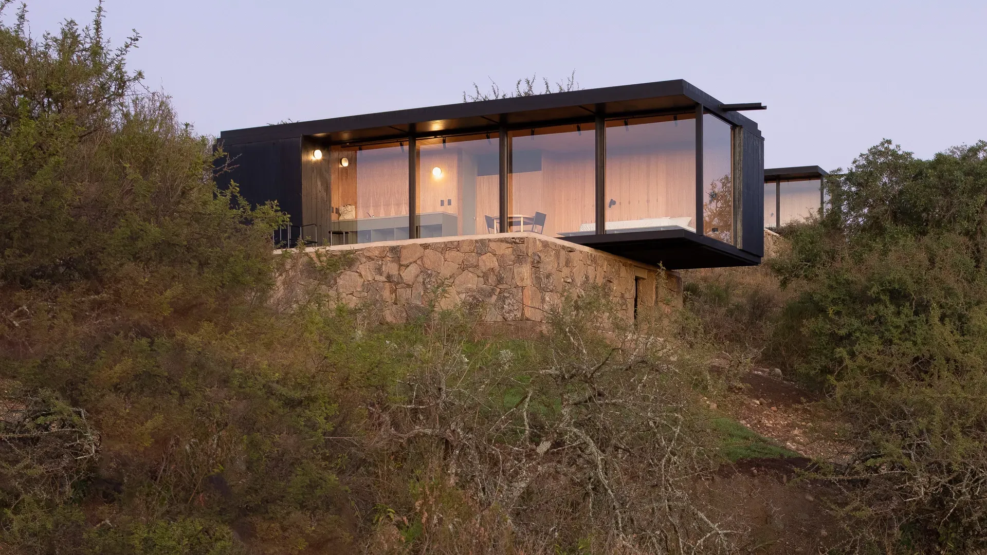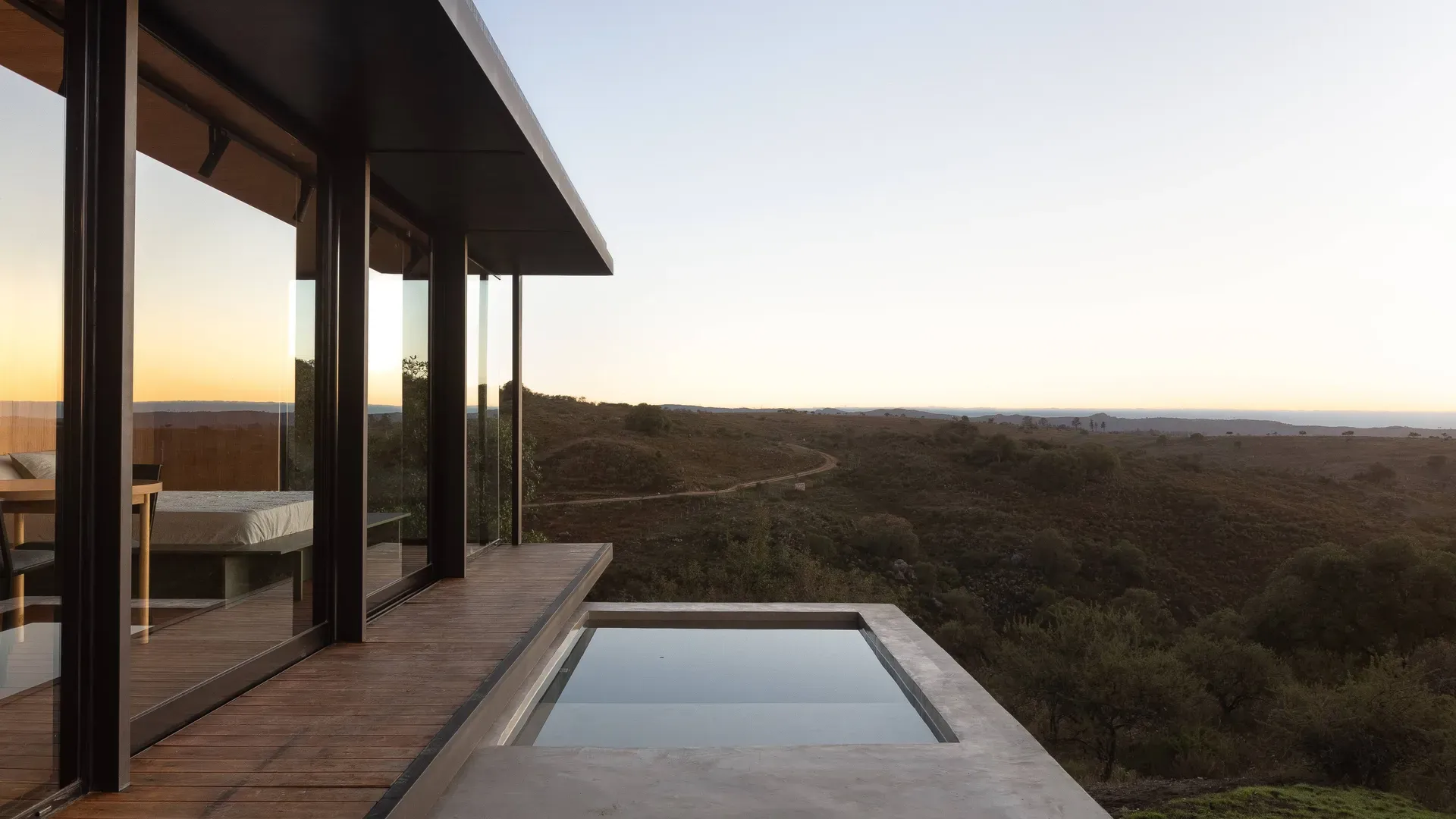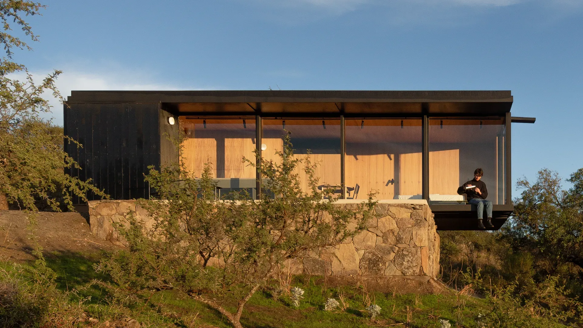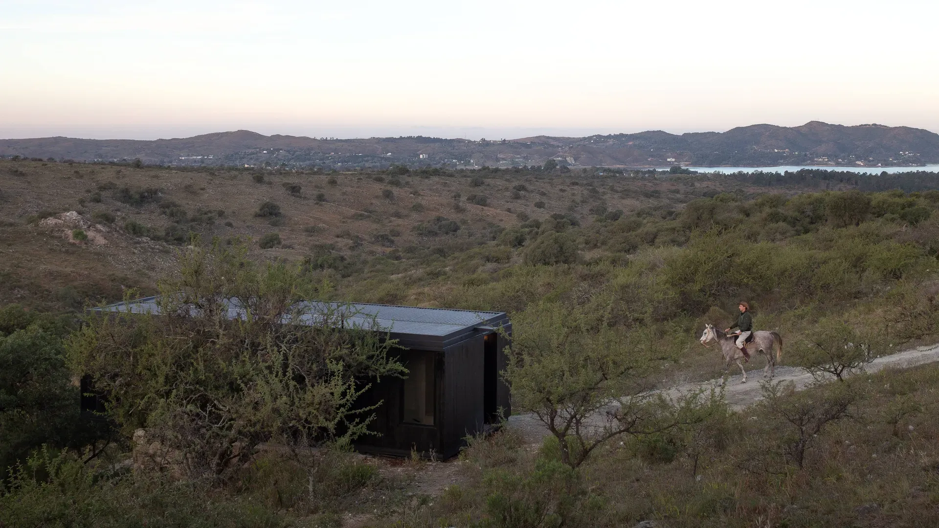 Un refugio minimalista de montaña para dos. La casa es un discreto escondite en las montañas de La Estancia, Córdoba, diseñada para dos huéspedes que valoran la simplicidad, la comodidad y la conexión con la naturaleza. Elevada en la ladera, su fachada de vidrio de 180° enmarca impresionantes vistas panorámicas, convirtiendo el paisaje circundante en un telón de fondo cambiante durante toda la estadía. En los días soleados, la casa se abre por completo para integrarse con el exterior; durante las tormentas, se cierra para crear un cálido y acogedor refugio.
