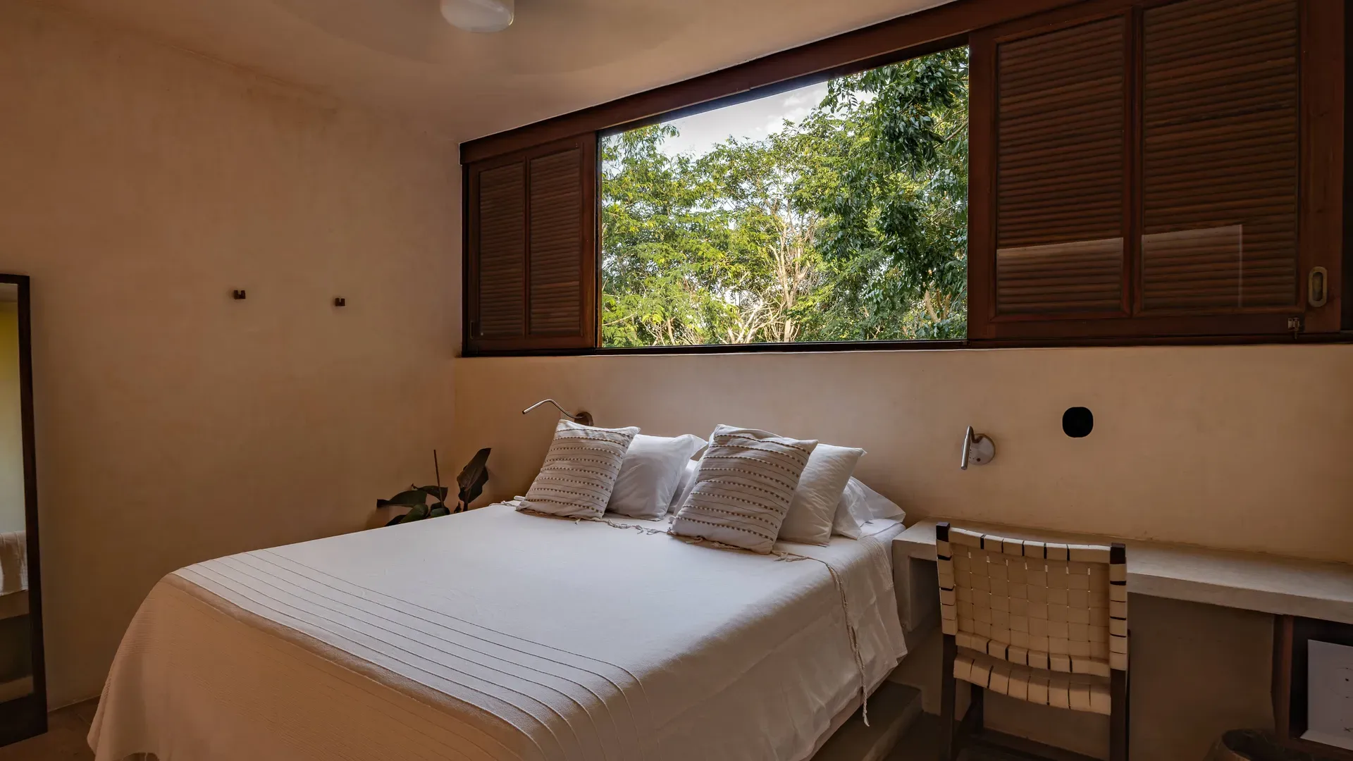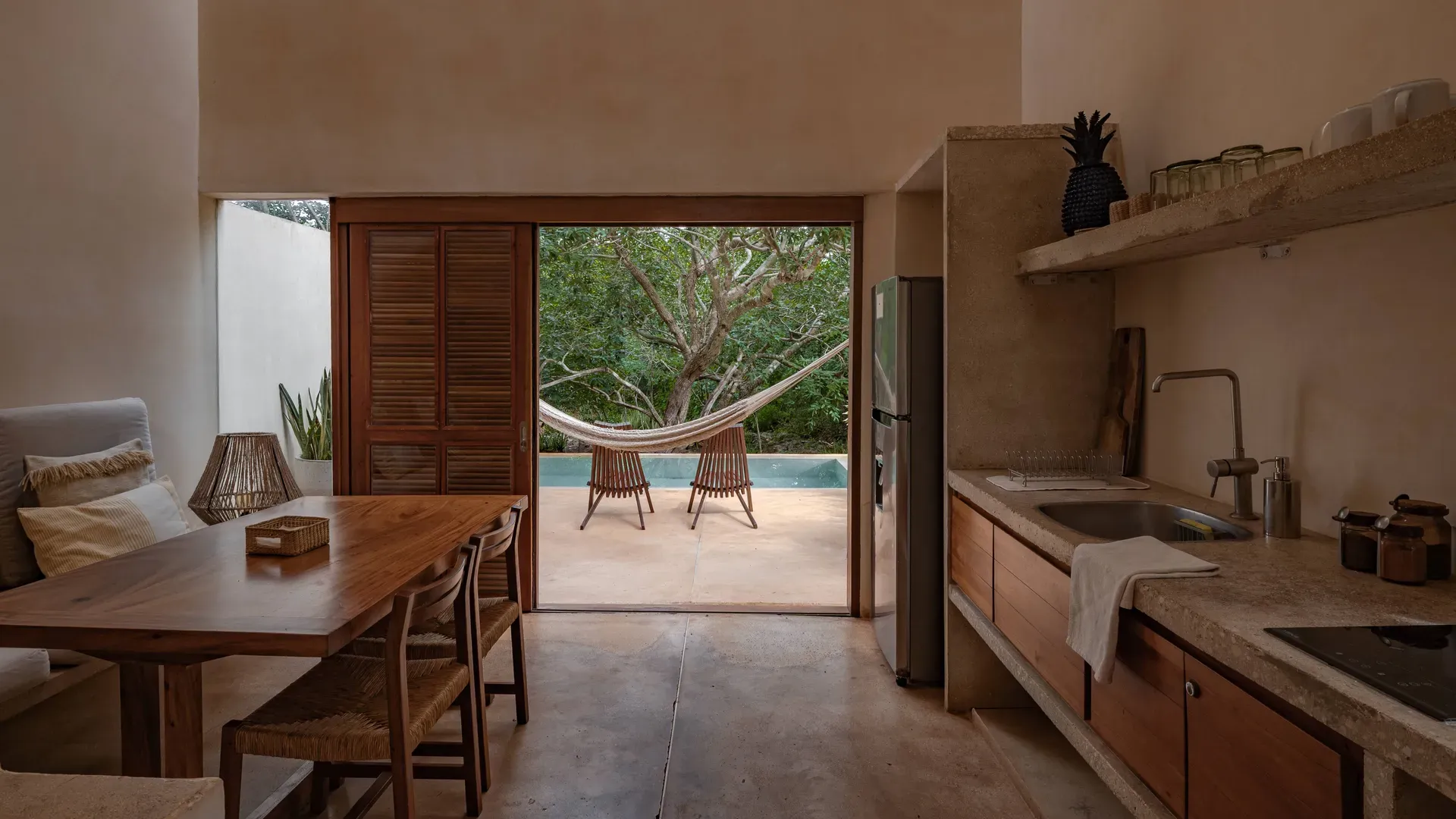 La propiedad cuenta con una cama tamaño queen con ropa de cama de algodón orgánico, una cocina totalmente equipada (refrigerador, estufa eléctrica, licuadora, tostadora, prensa francesa e insumos básicos para cocinar), una regadera a cielo abierto con amenidades de lujo elaboradas artesanalmente con ingredientes locales y una piscina privada con vista a la selva circundante. Los huéspedes también pueden disfrutar de una terraza con hamaca y bicicletas de cortesía para explorar los atractivos cercanos.