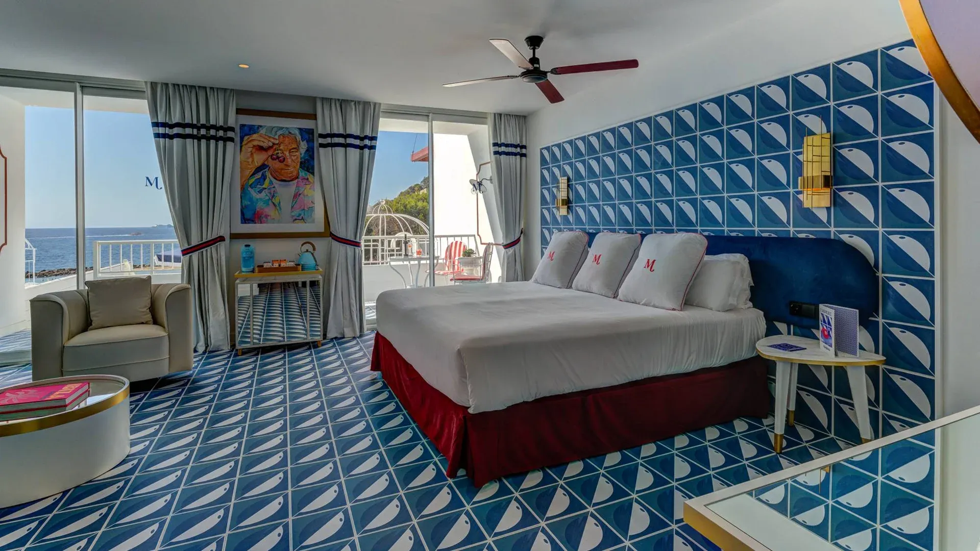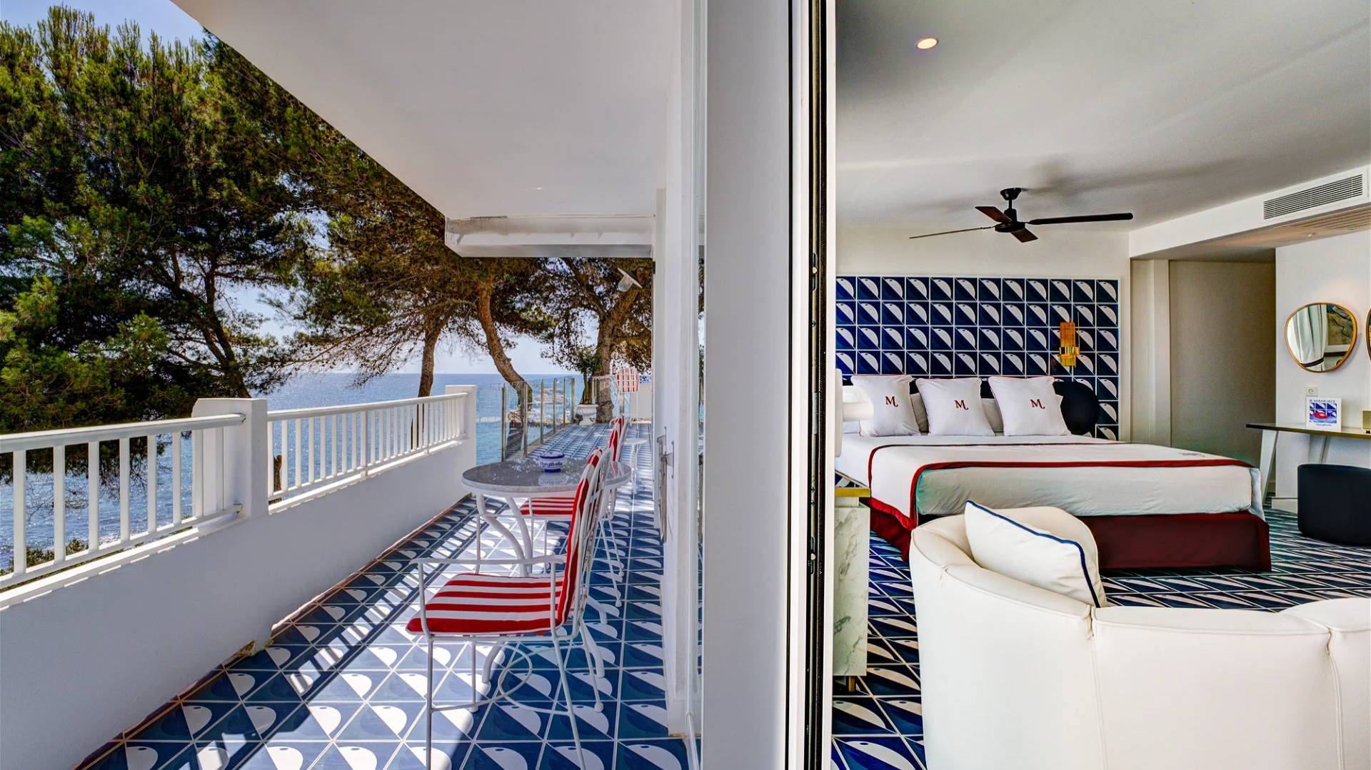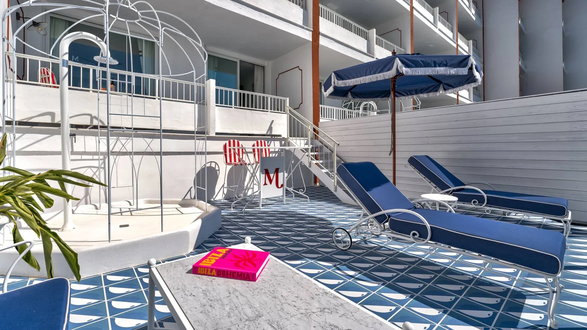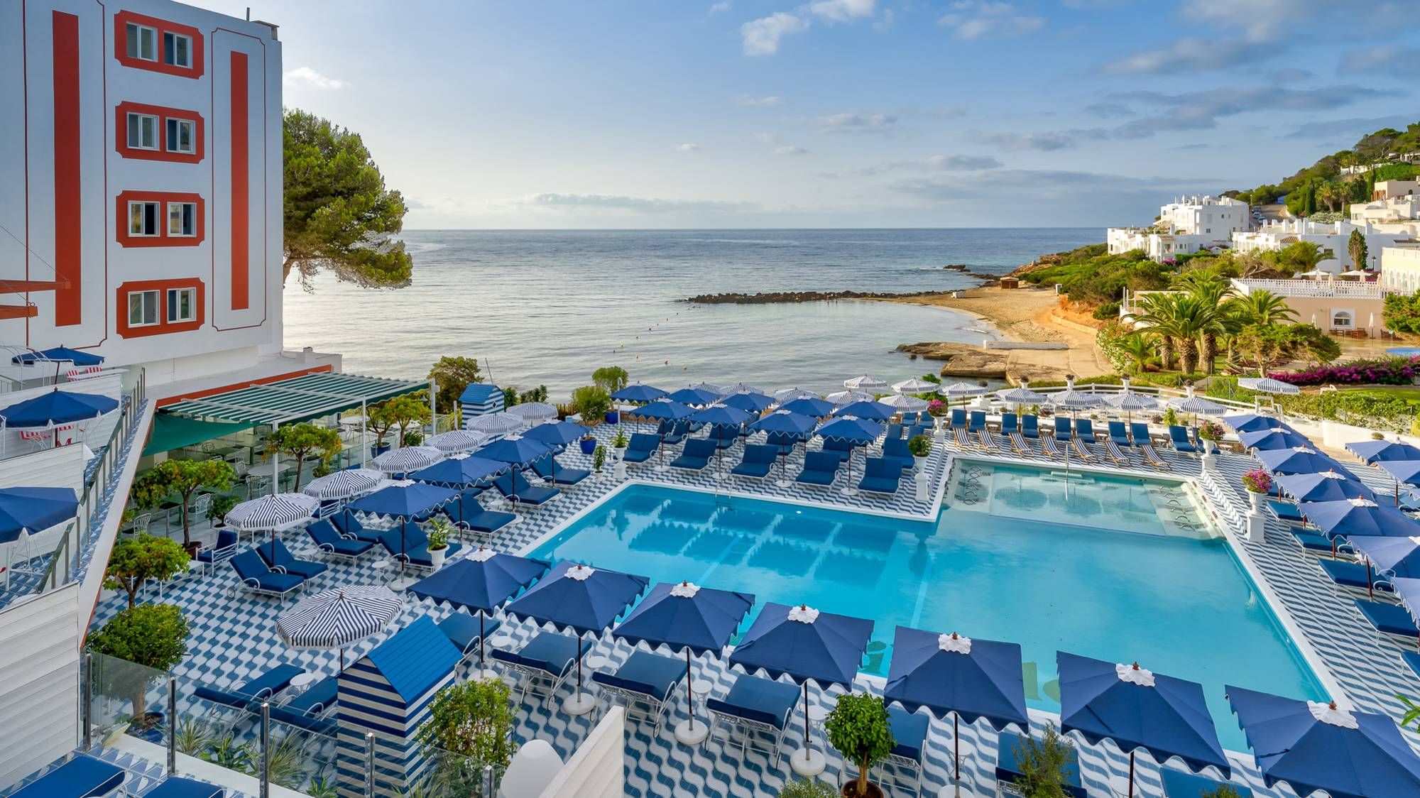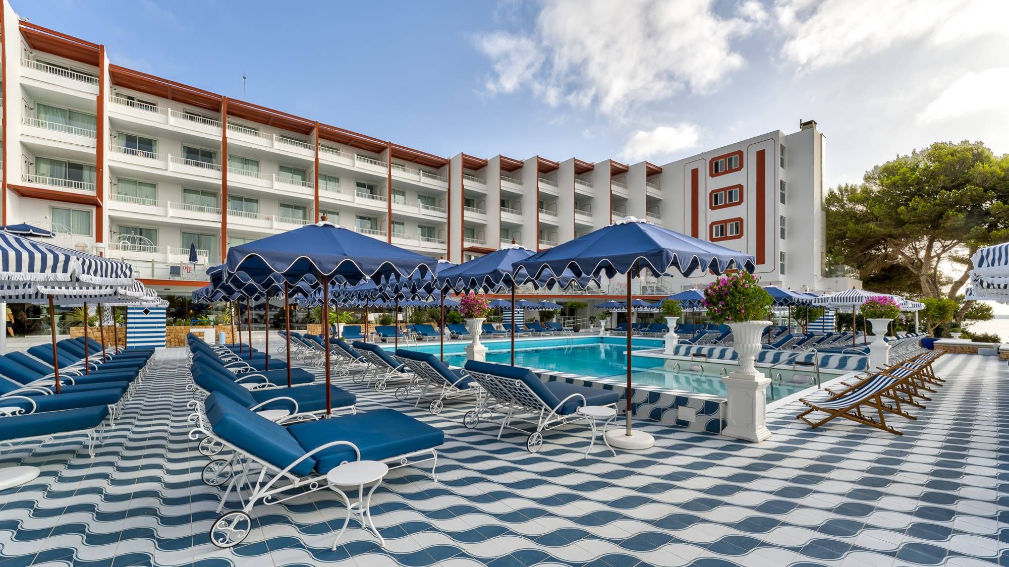 Cada una de las 167 habitaciones y 32 suites cuenta una historia, decorada con diseños exclusivos que rinden homenaje a figuras icónicas del pasado de Ibiza. El vestíbulo, con su tocadiscos vintage de los años 70 y el icónico Alfa Romeo Spider en la entrada, marca el tono para una estancia impregnada de nostalgia y elegancia. La piscina azul celeste, flanqueada por sombrillas retro en azul y blanco, ofrece vistas panorámicas al Mediterráneo, invitando a sumergirse en su tranquilidad.