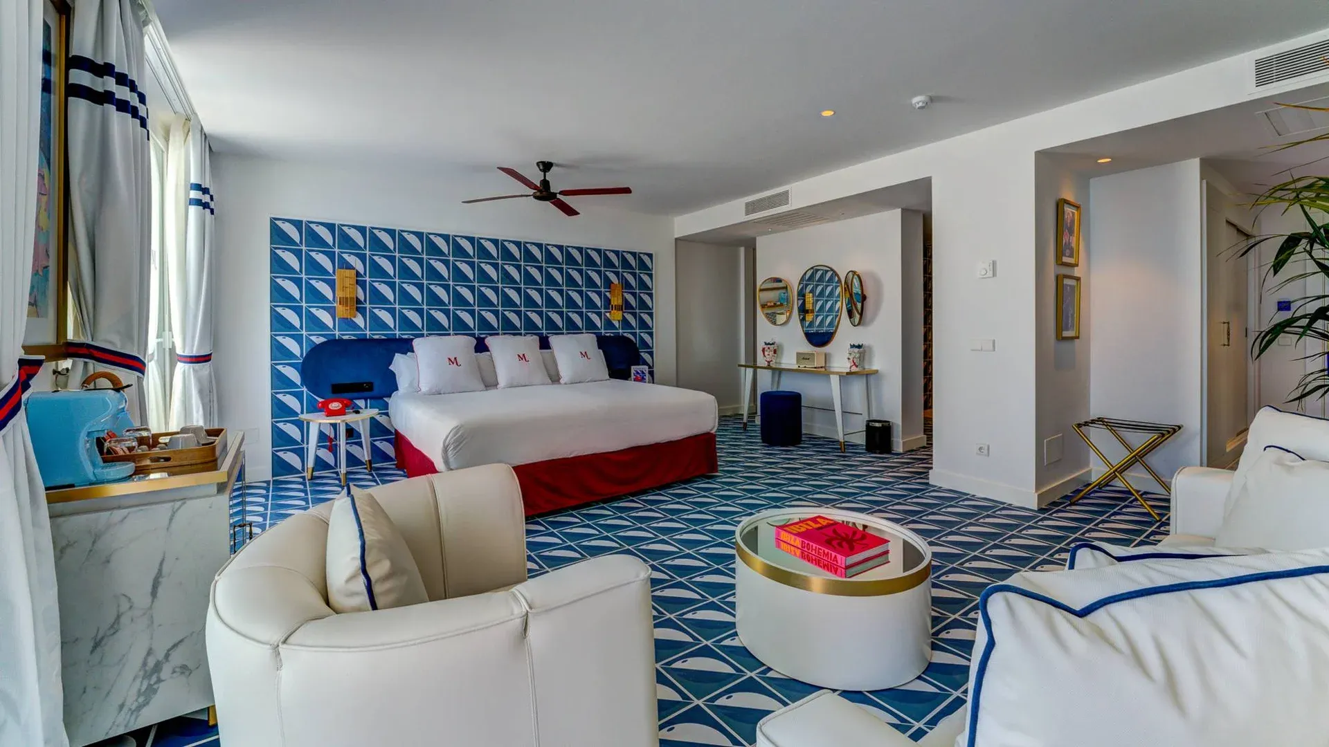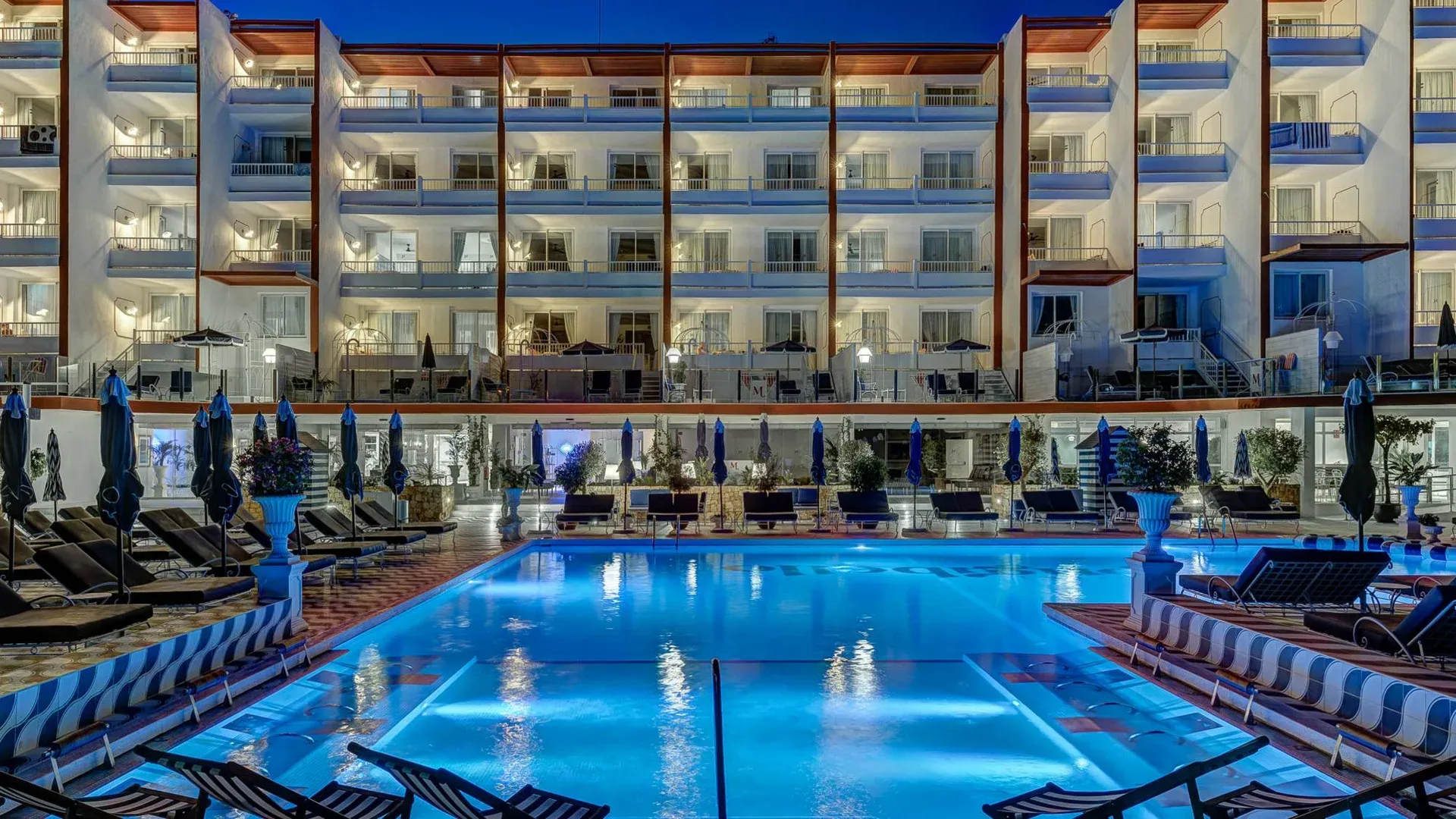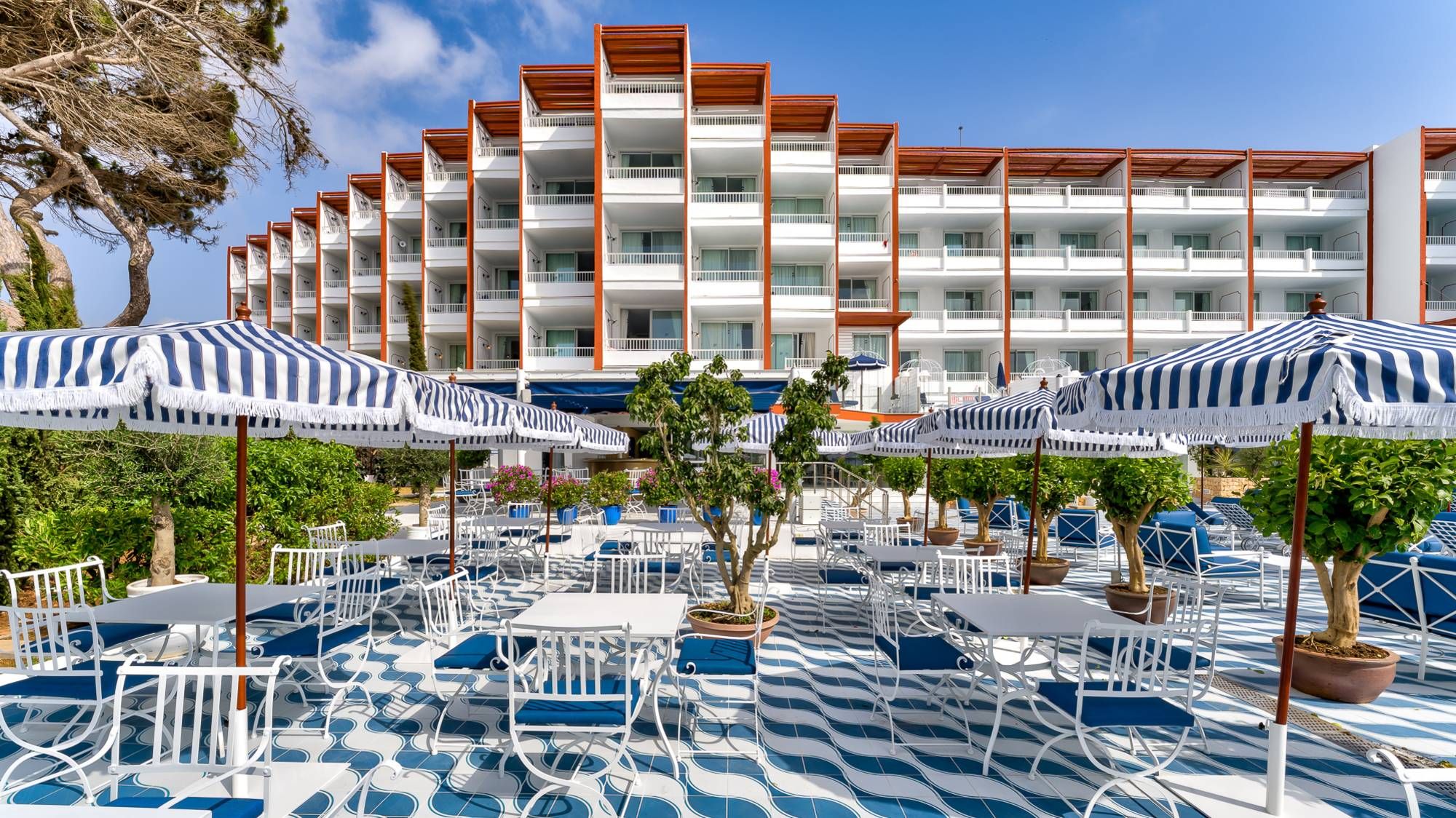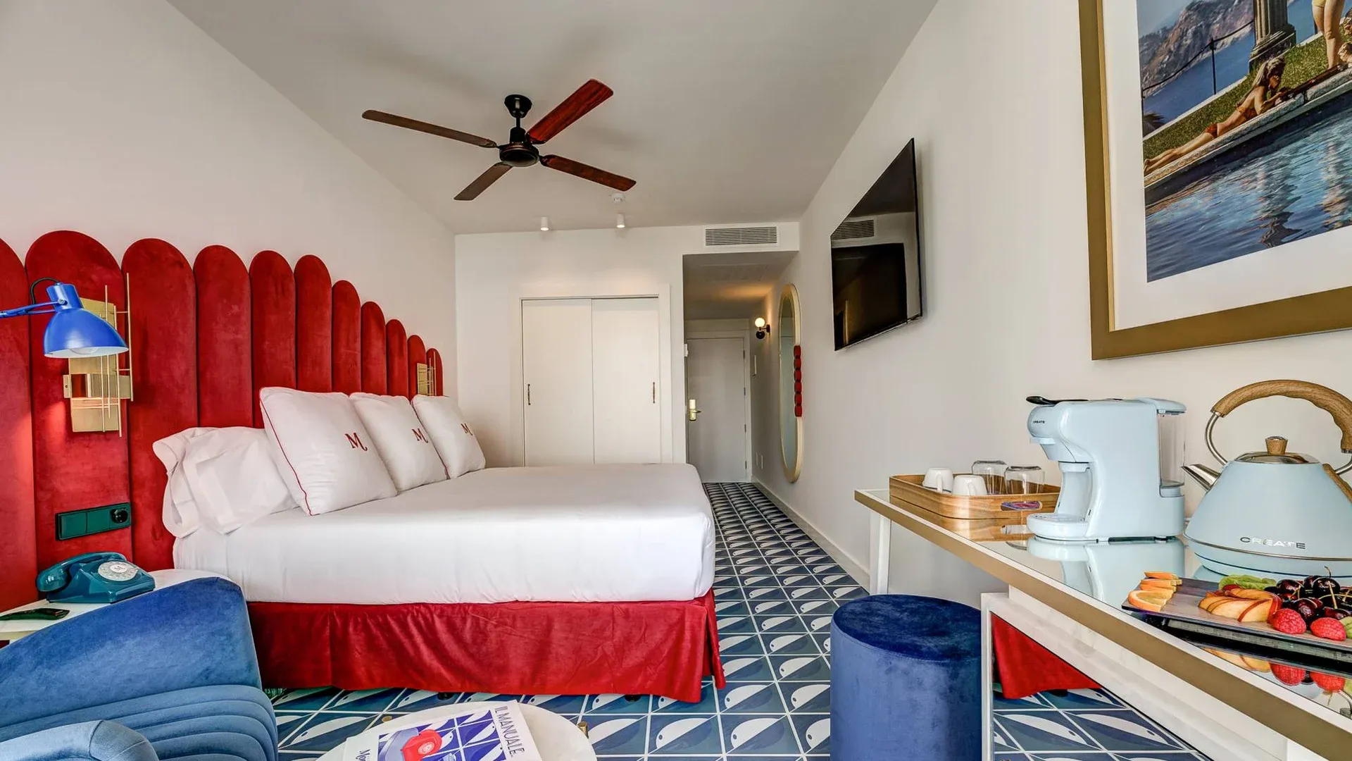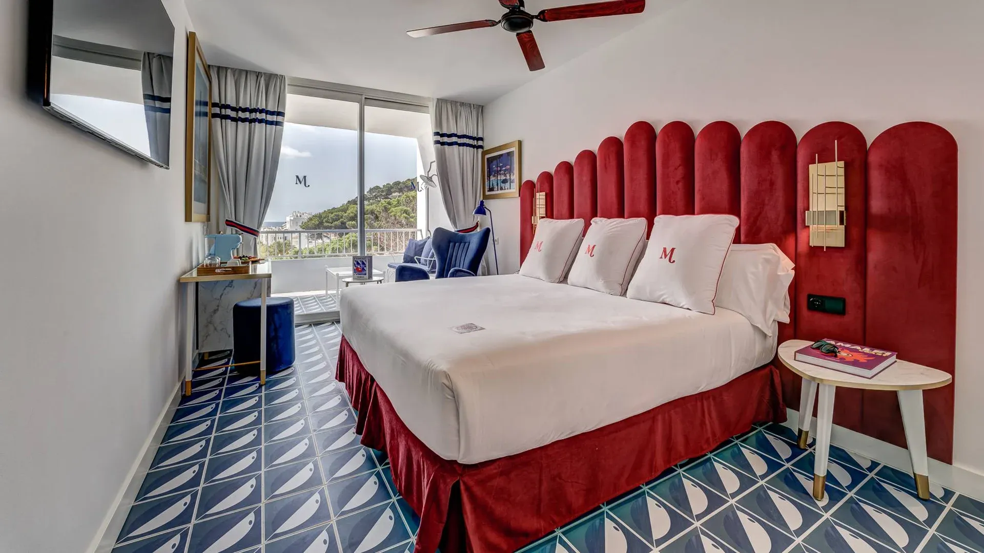 Cada una de las 167 habitaciones y 32 suites cuenta una historia, decorada con diseños exclusivos que rinden homenaje a figuras icónicas del pasado de Ibiza. El vestíbulo, con su tocadiscos vintage de los años 70 y el icónico Alfa Romeo Spider en la entrada, marca el tono para una estancia impregnada de nostalgia y elegancia. La piscina azul celeste, flanqueada por sombrillas retro en azul y blanco, ofrece vistas panorámicas al Mediterráneo, invitando a sumergirse en su tranquilidad.