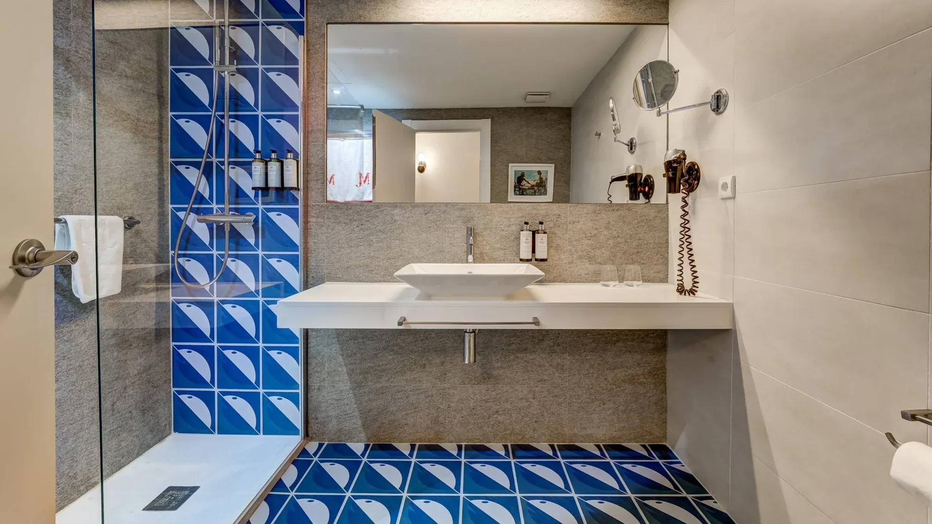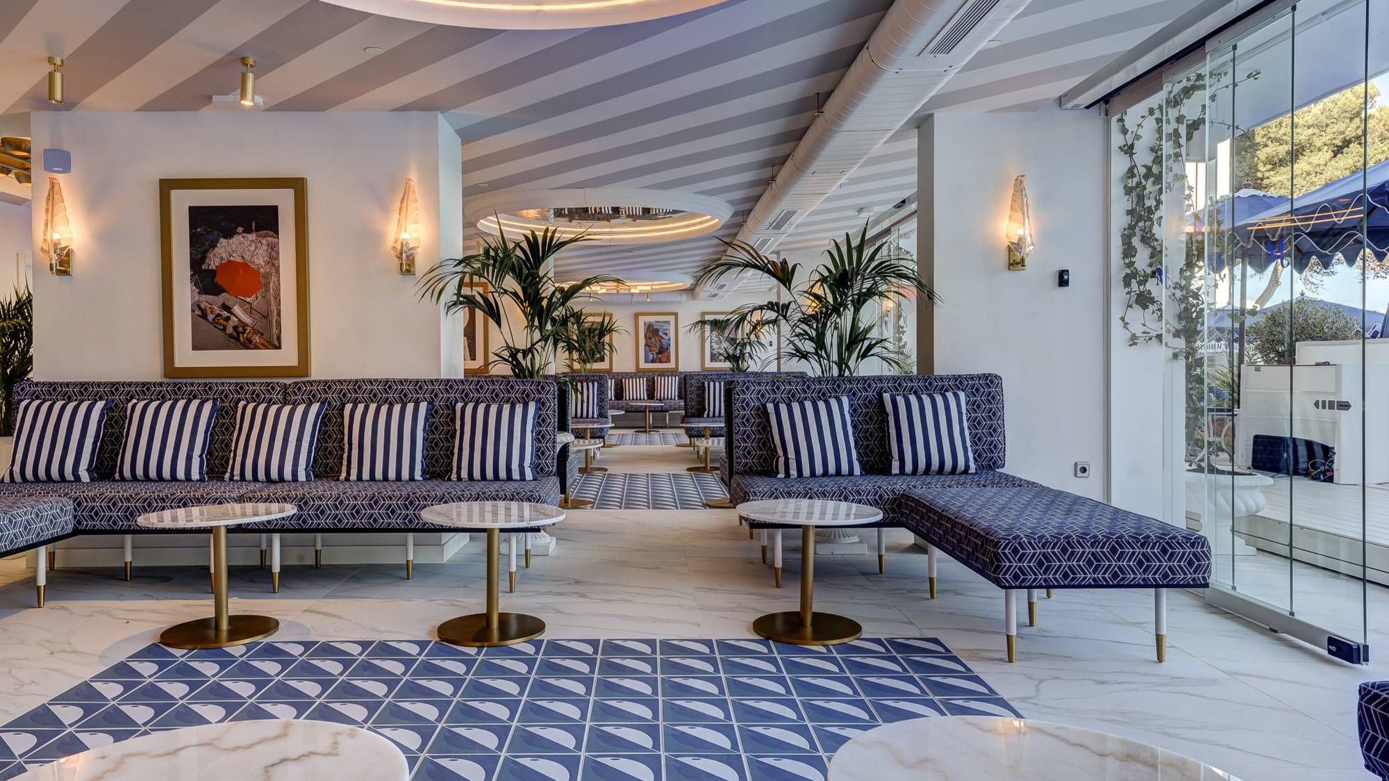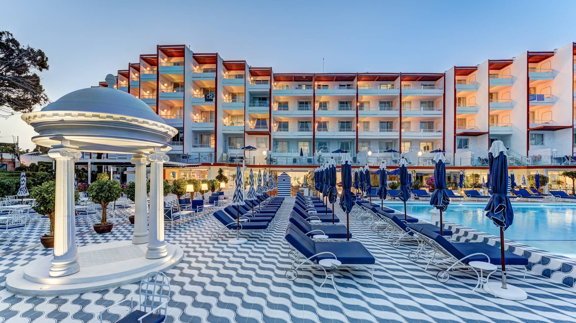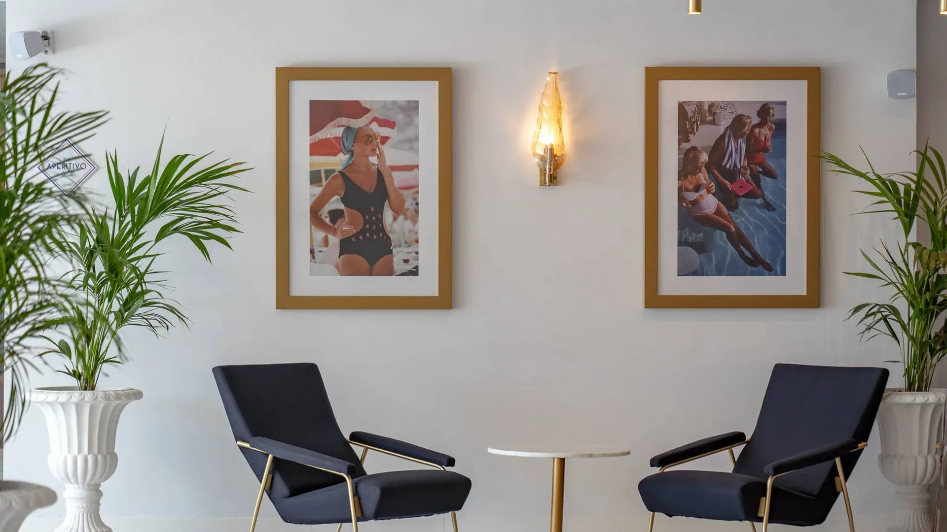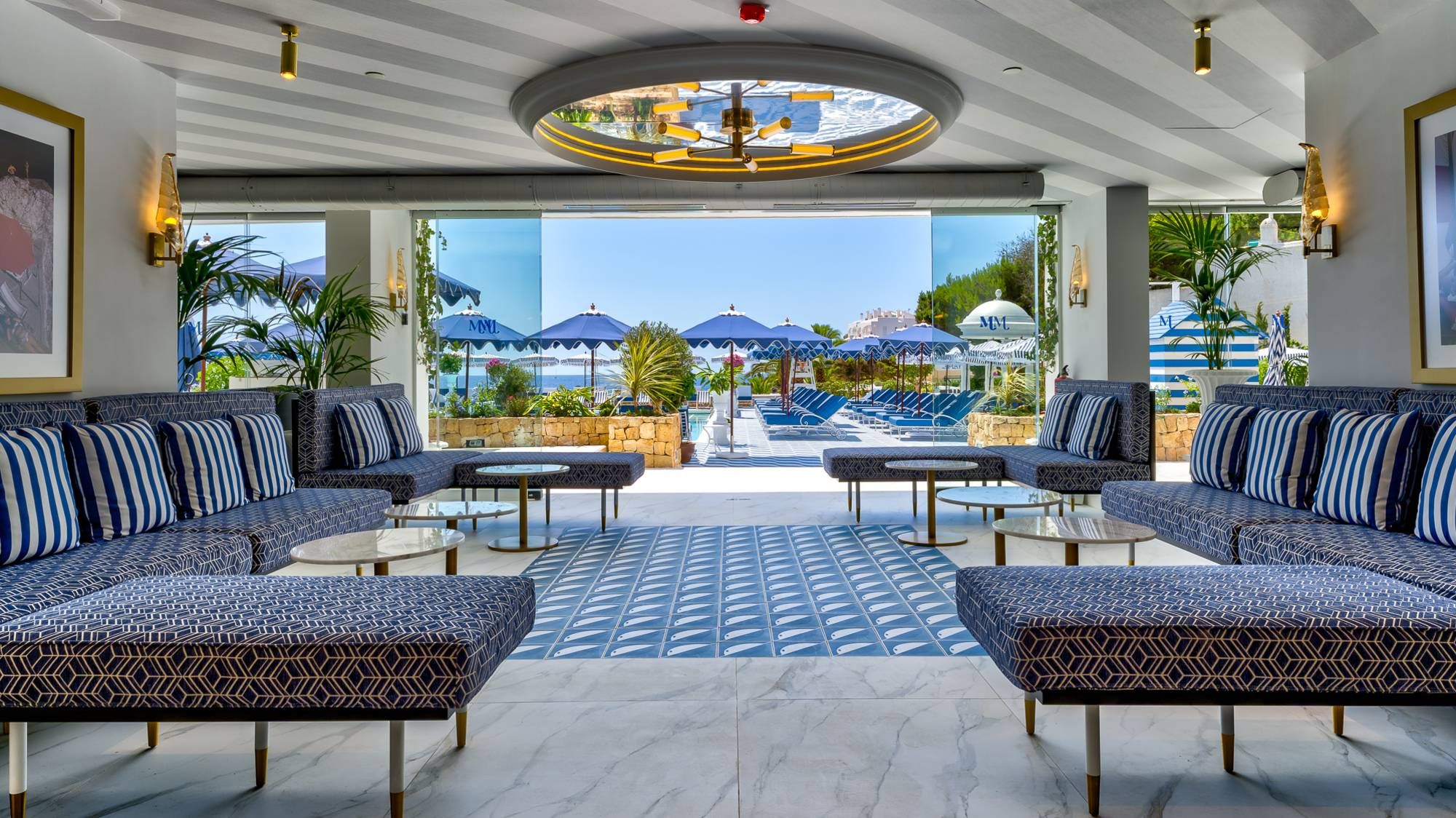 Cada una de las 167 habitaciones y 32 suites cuenta una historia, decorada con diseños exclusivos que rinden homenaje a figuras icónicas del pasado de Ibiza. El vestíbulo, con su tocadiscos vintage de los años 70 y el icónico Alfa Romeo Spider en la entrada, marca el tono para una estancia impregnada de nostalgia y elegancia. La piscina azul celeste, flanqueada por sombrillas retro en azul y blanco, ofrece vistas panorámicas al Mediterráneo, invitando a sumergirse en su tranquilidad.