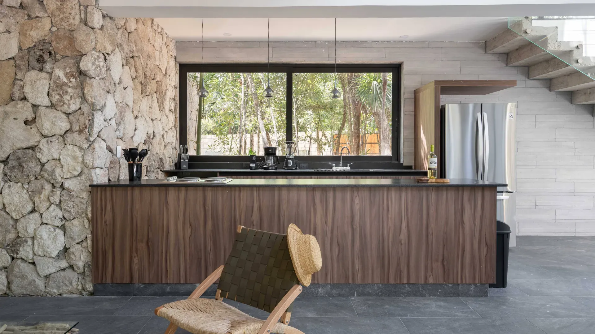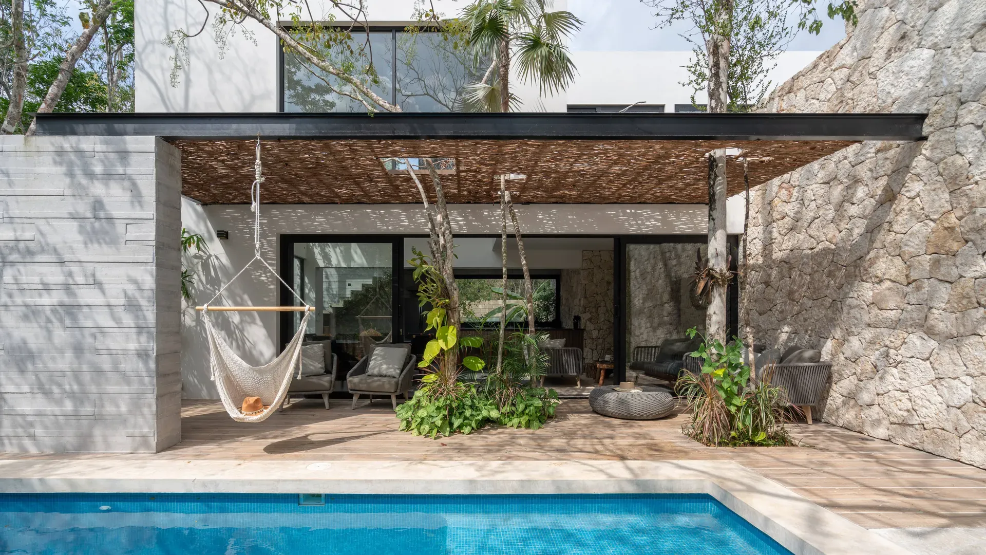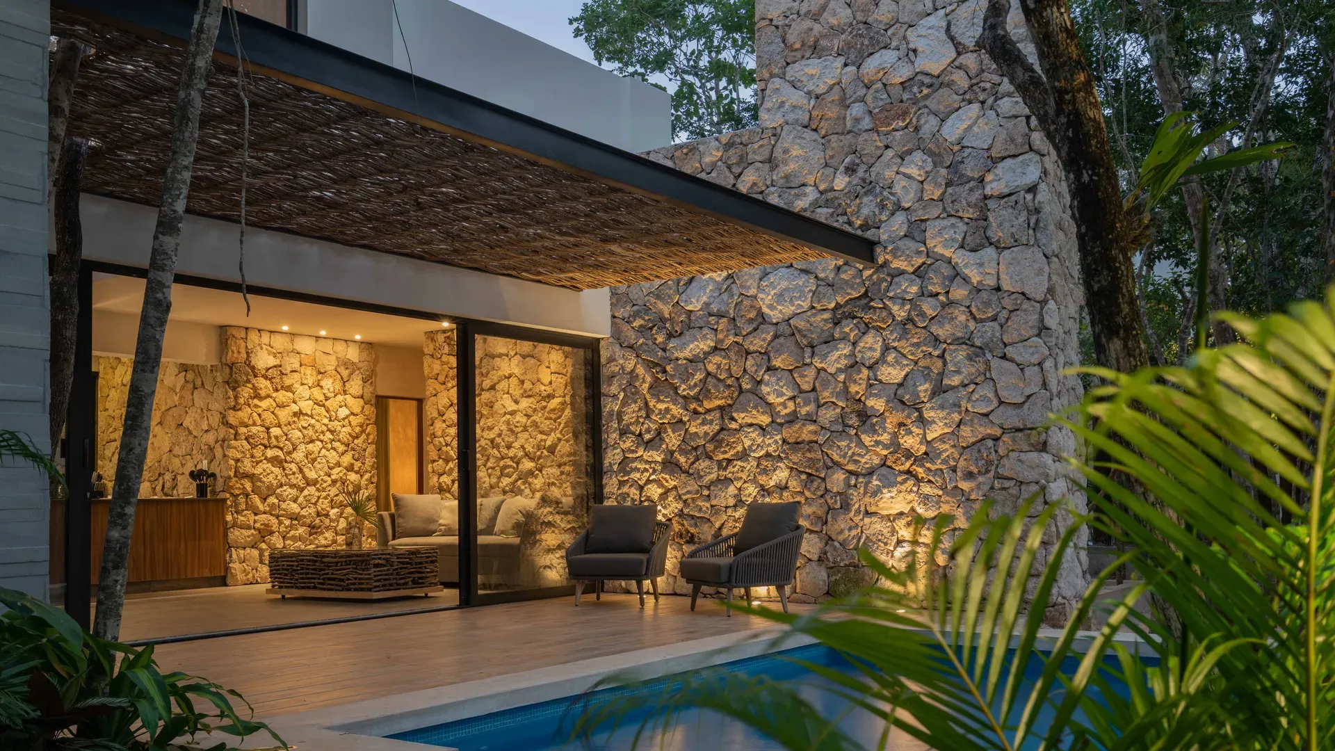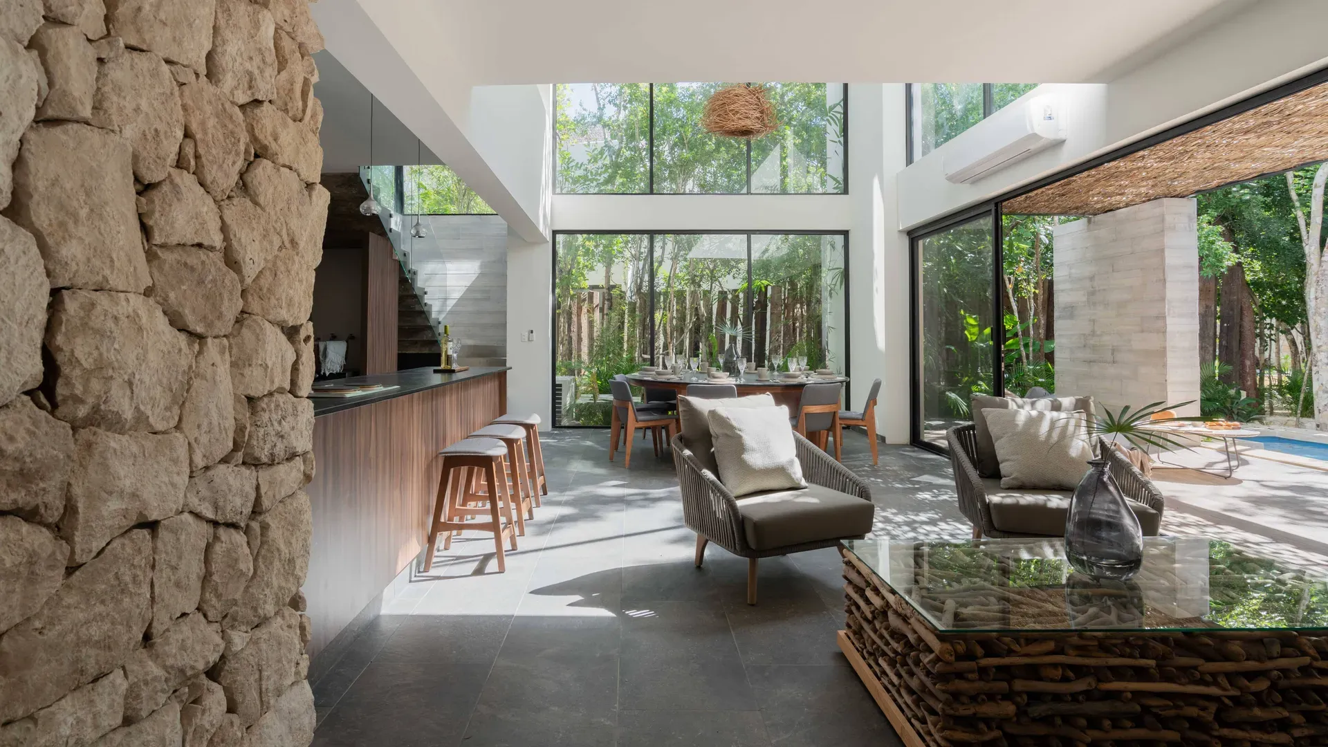 Twelve O’Clock Villas combina un diseño moderno y elegante con elementos tropicales naturales. Interiores de planta abierta, grandes ventanales y detalles en piedra y madera natural crean espacios luminosos y aireados que armonizan con la vegetación circundante, mientras que las terrazas privadas y las piscinas de inmersión extienden el espacio de vida hacia el exterior.