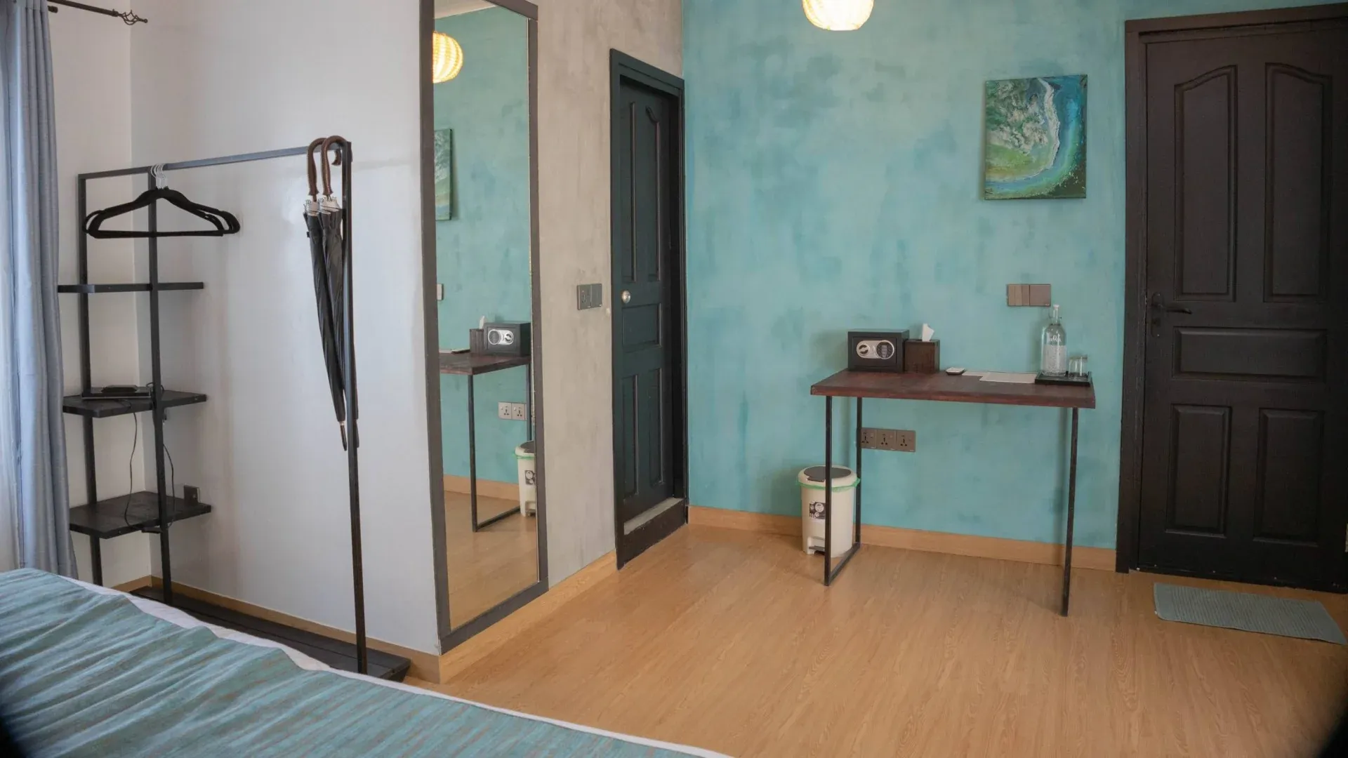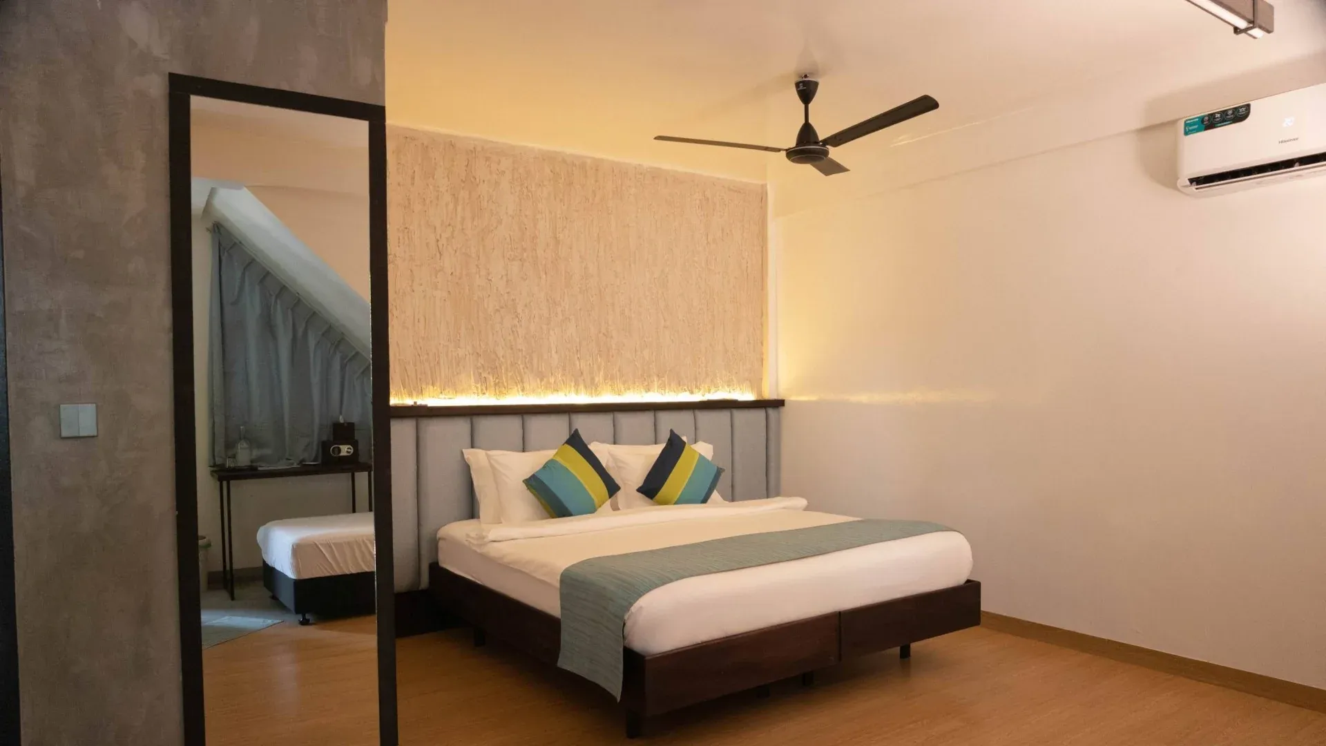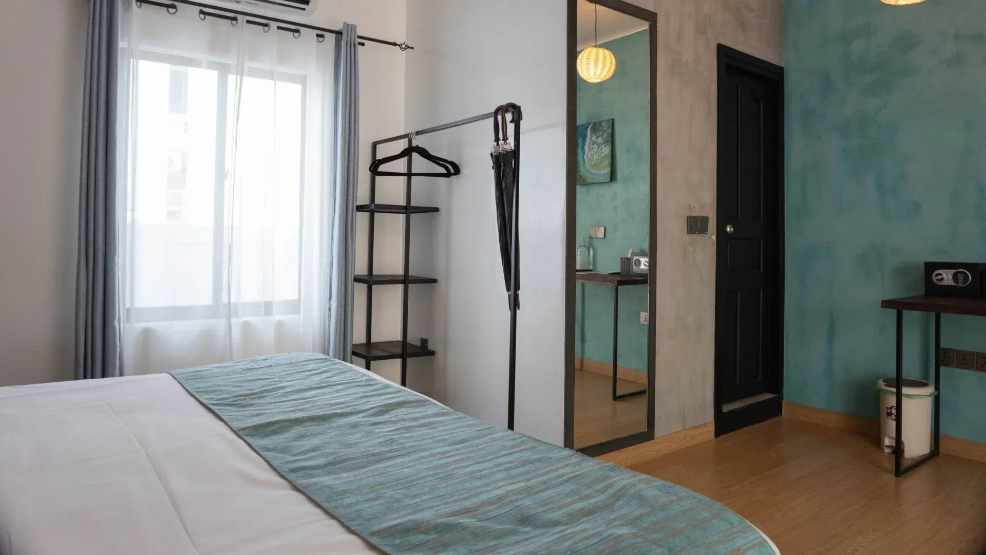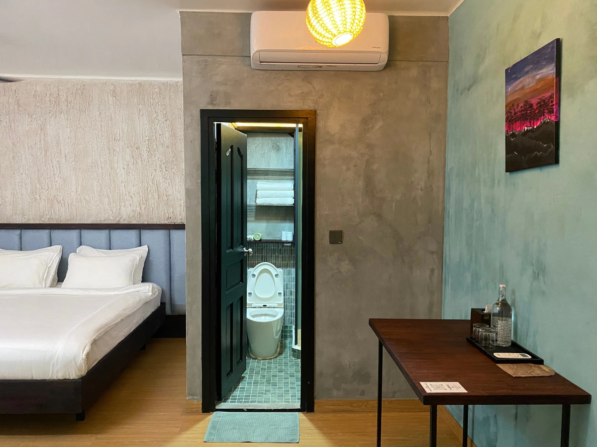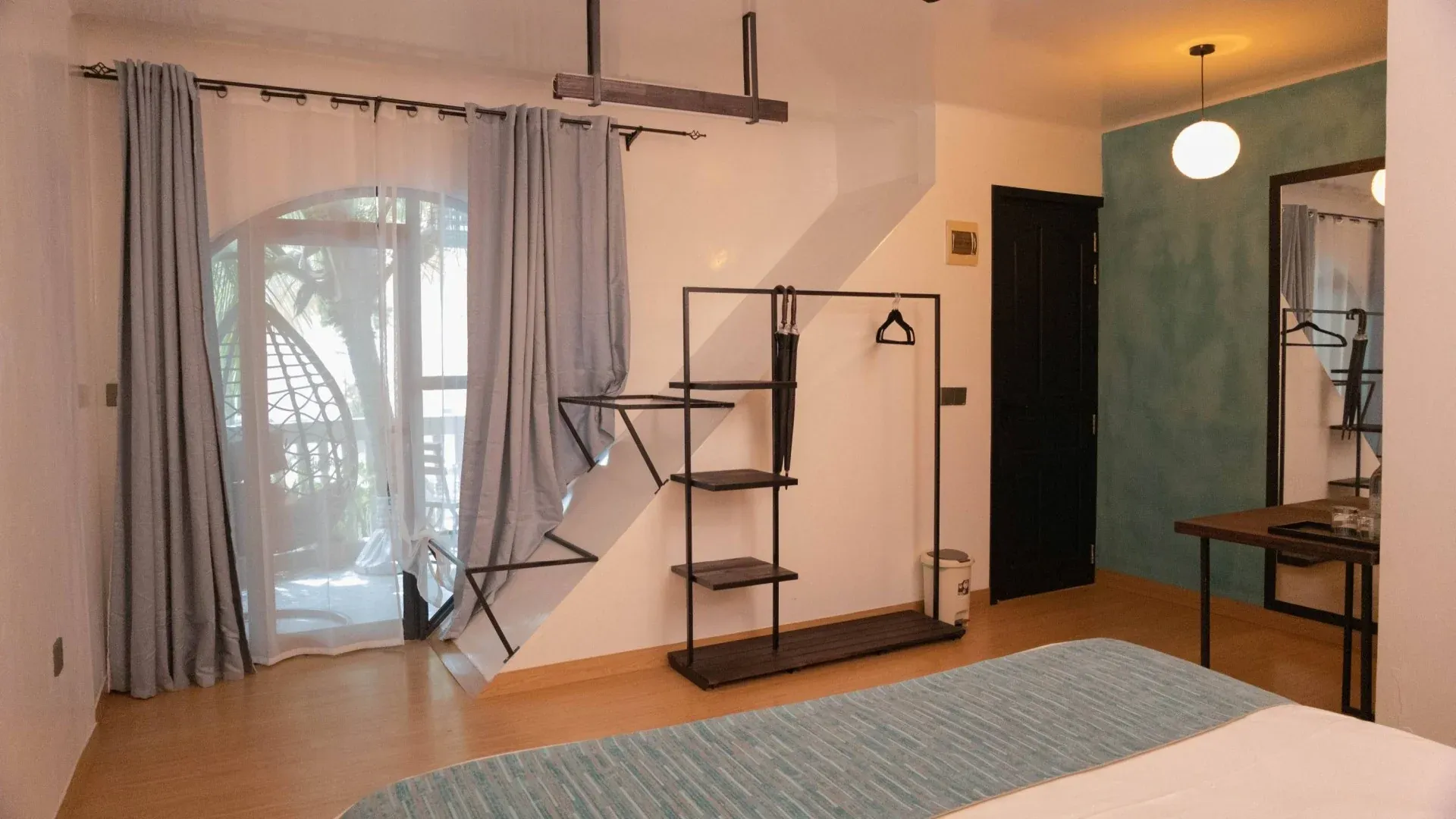 Habitación moderna con vistas al jardín, equipada con un amplio conjunto de comodidades, baño privado y una cama doble más una cama individual.