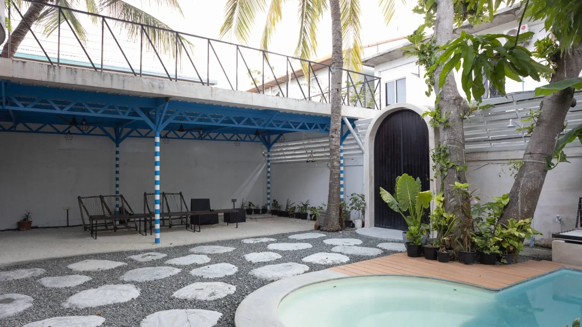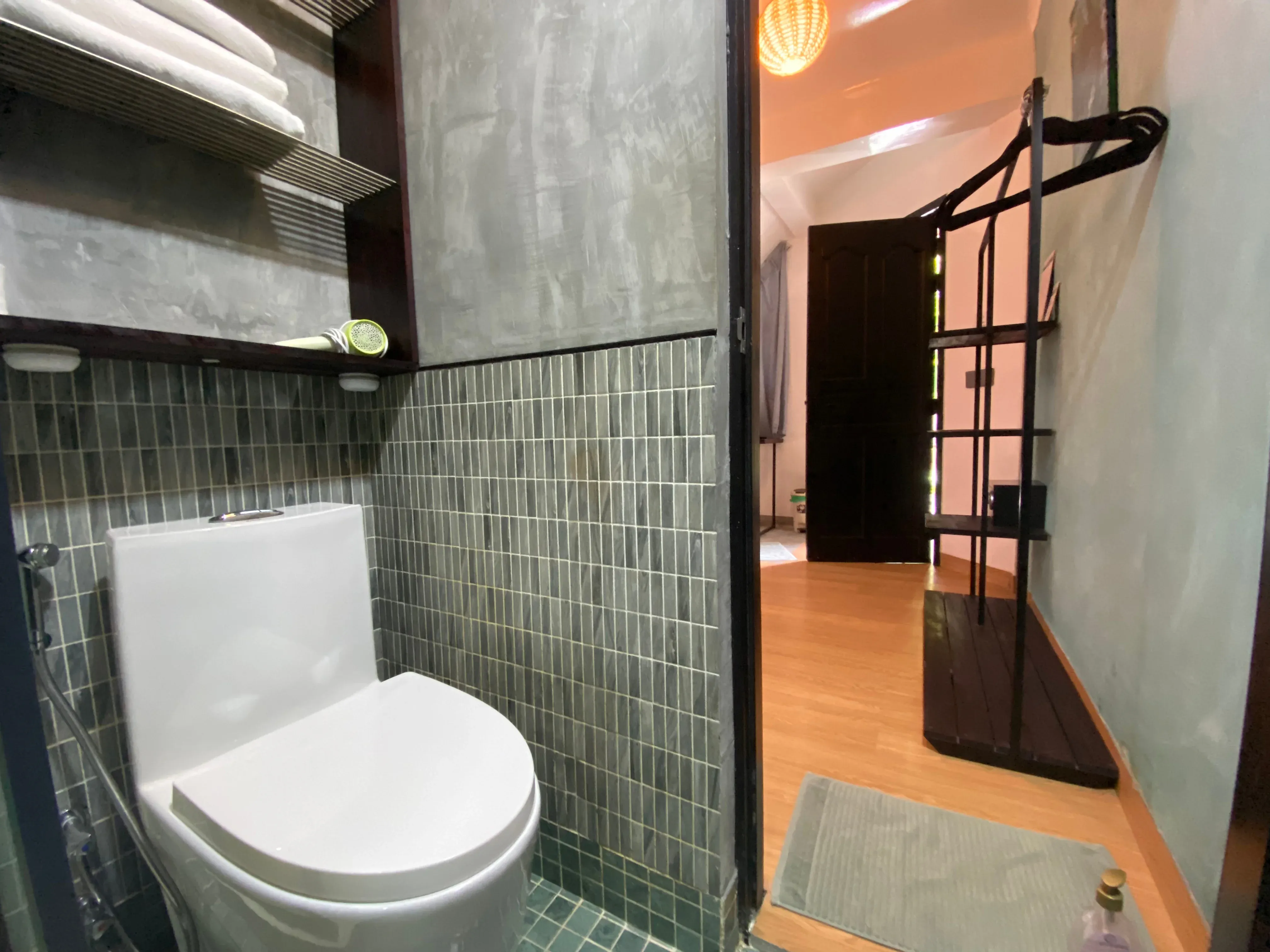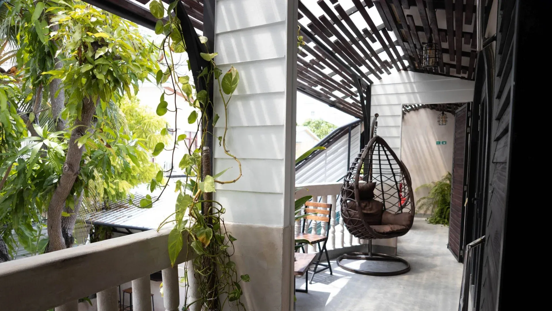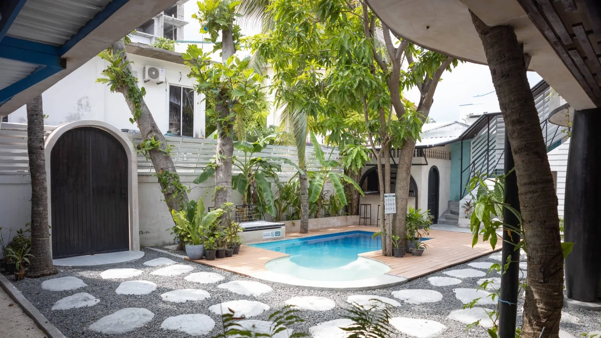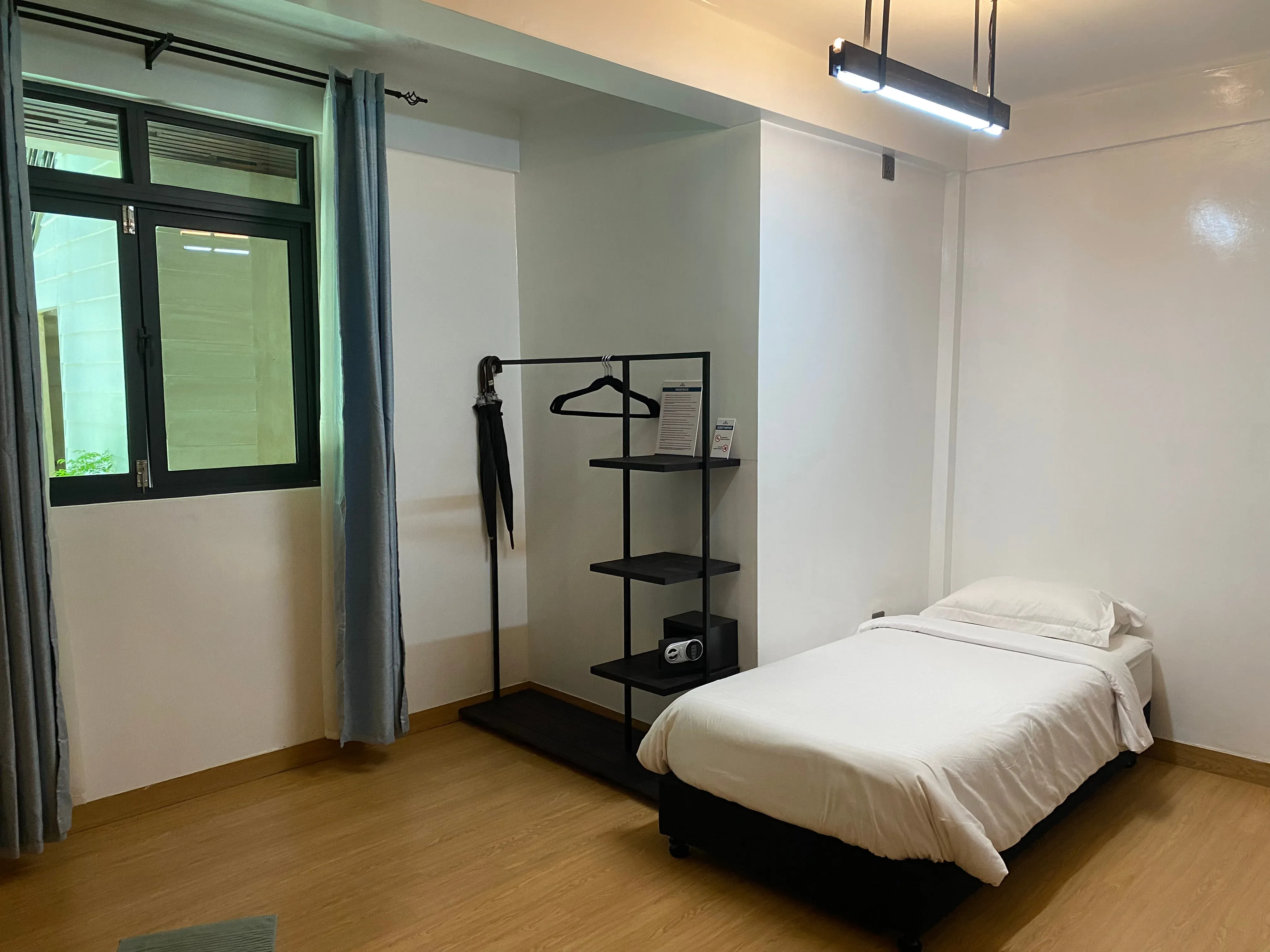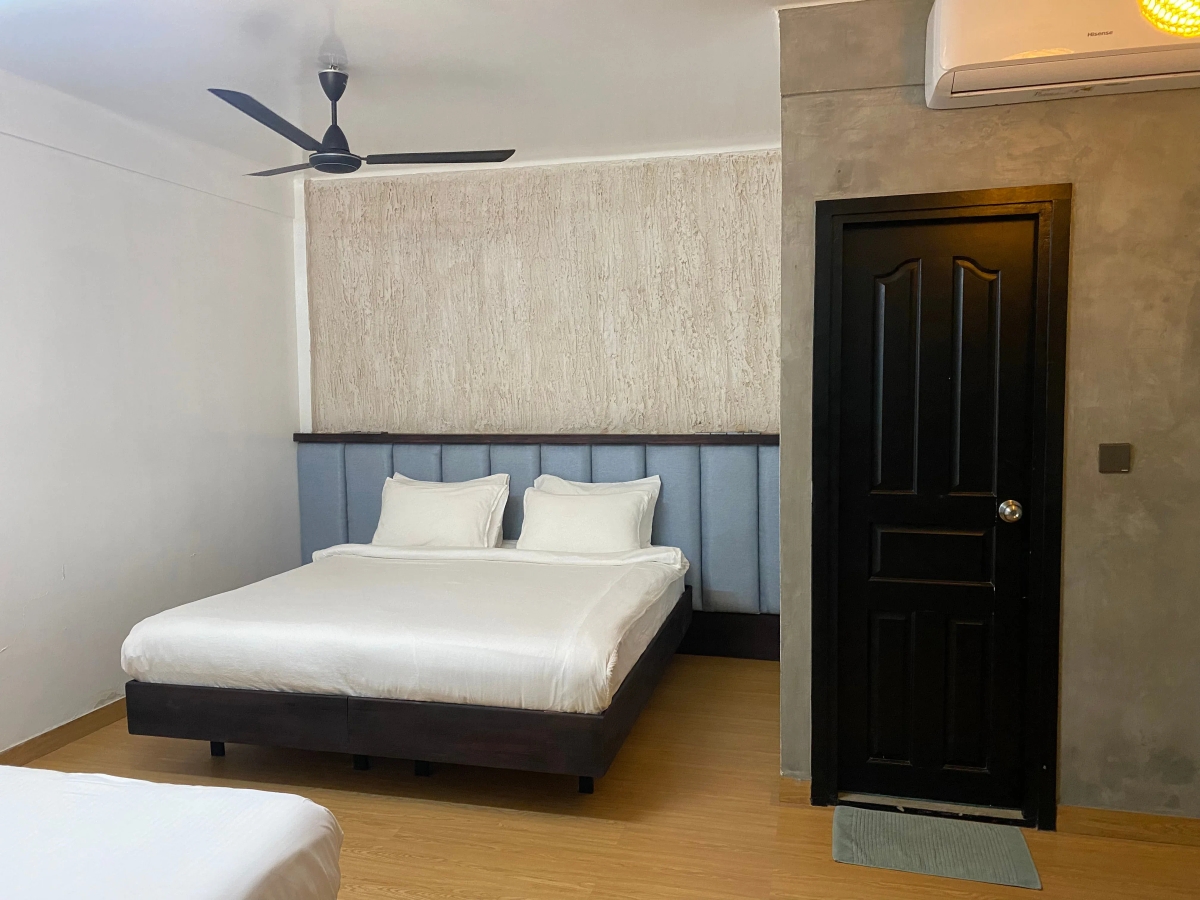 Habitación moderna con vistas al jardín, equipada con un amplio conjunto de comodidades, baño privado y una cama doble más una cama individual.