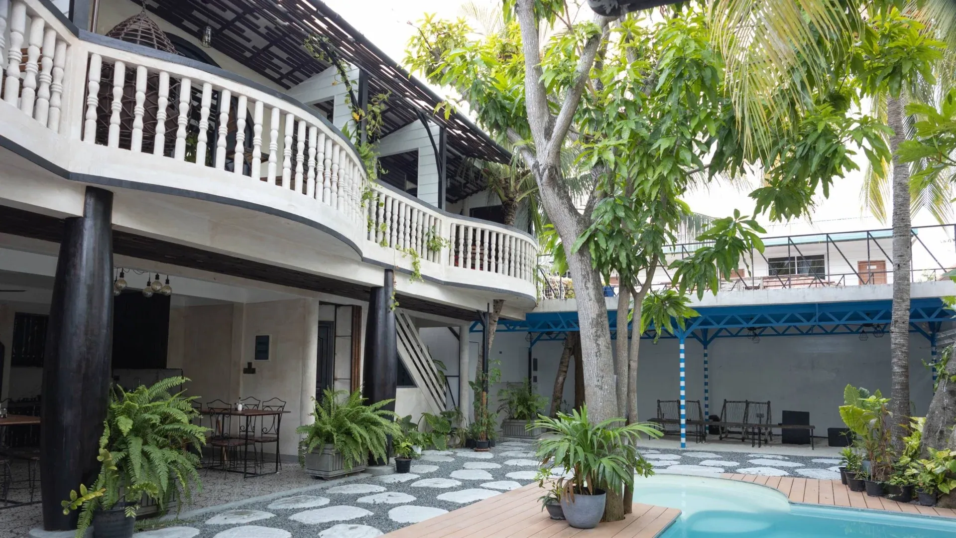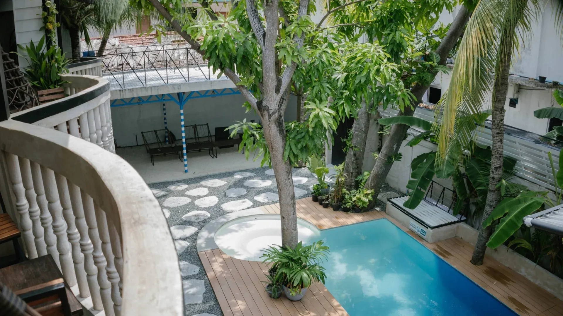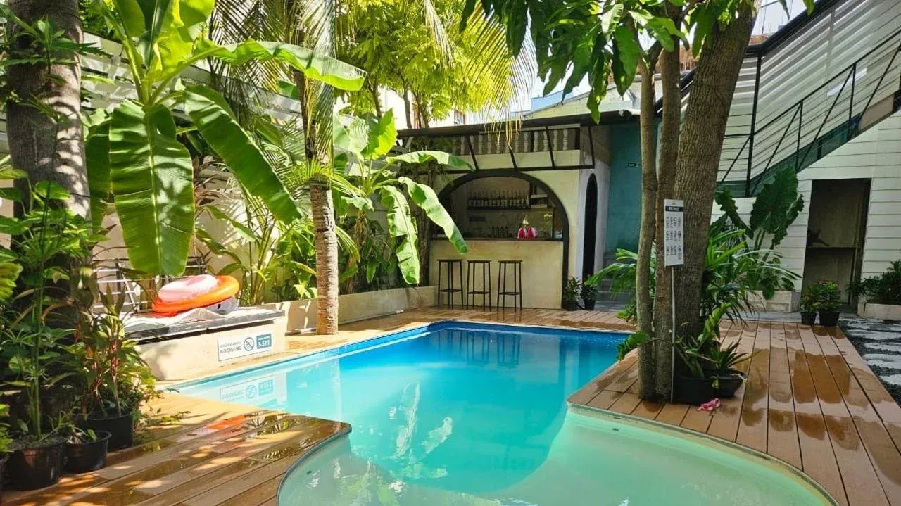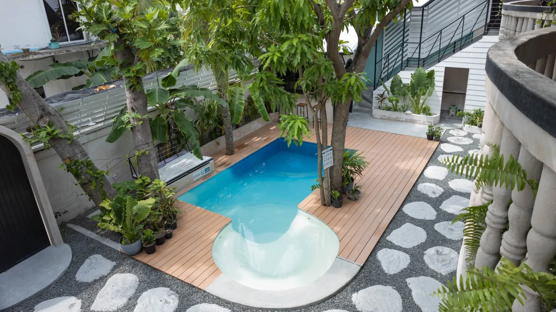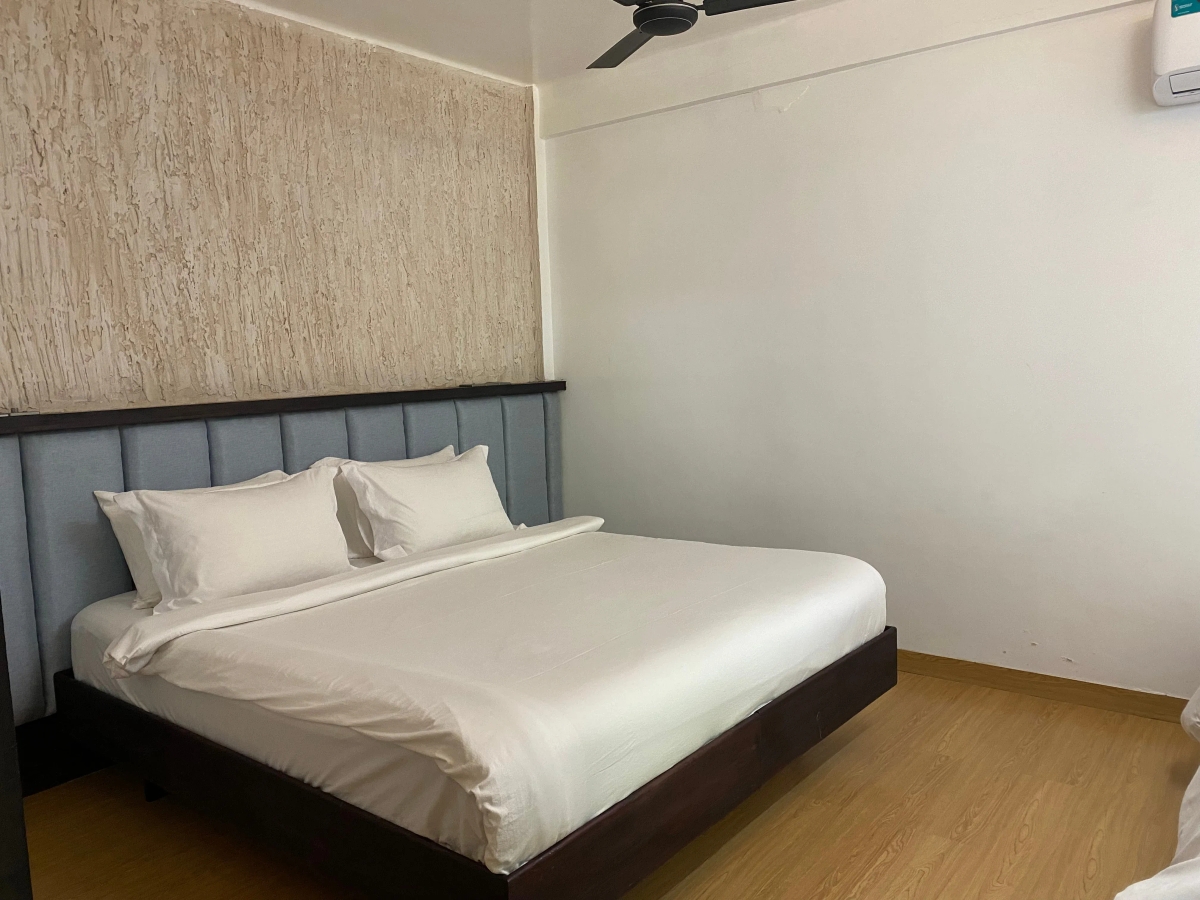 Habitación moderna con vistas al jardín, equipada con un amplio conjunto de comodidades, baño privado y una cama doble más una cama individual.