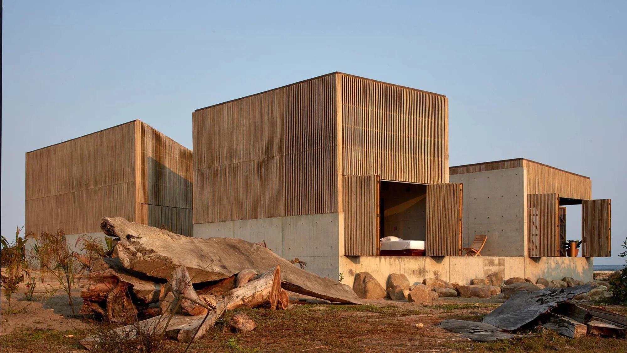 Local woods and natural materials are used throughout, minimizing technological intrusion. The forest bungalows are set back from the coastline to help preserve the local ecology, while the seafront terraces extend toward the water, blurring the boundary between built space and the marine landscape.